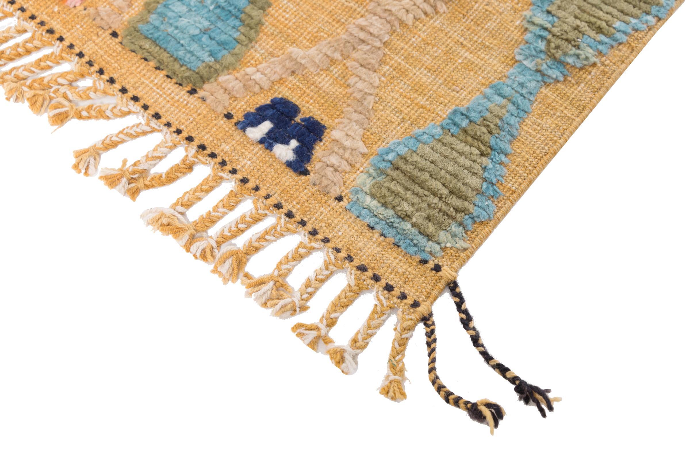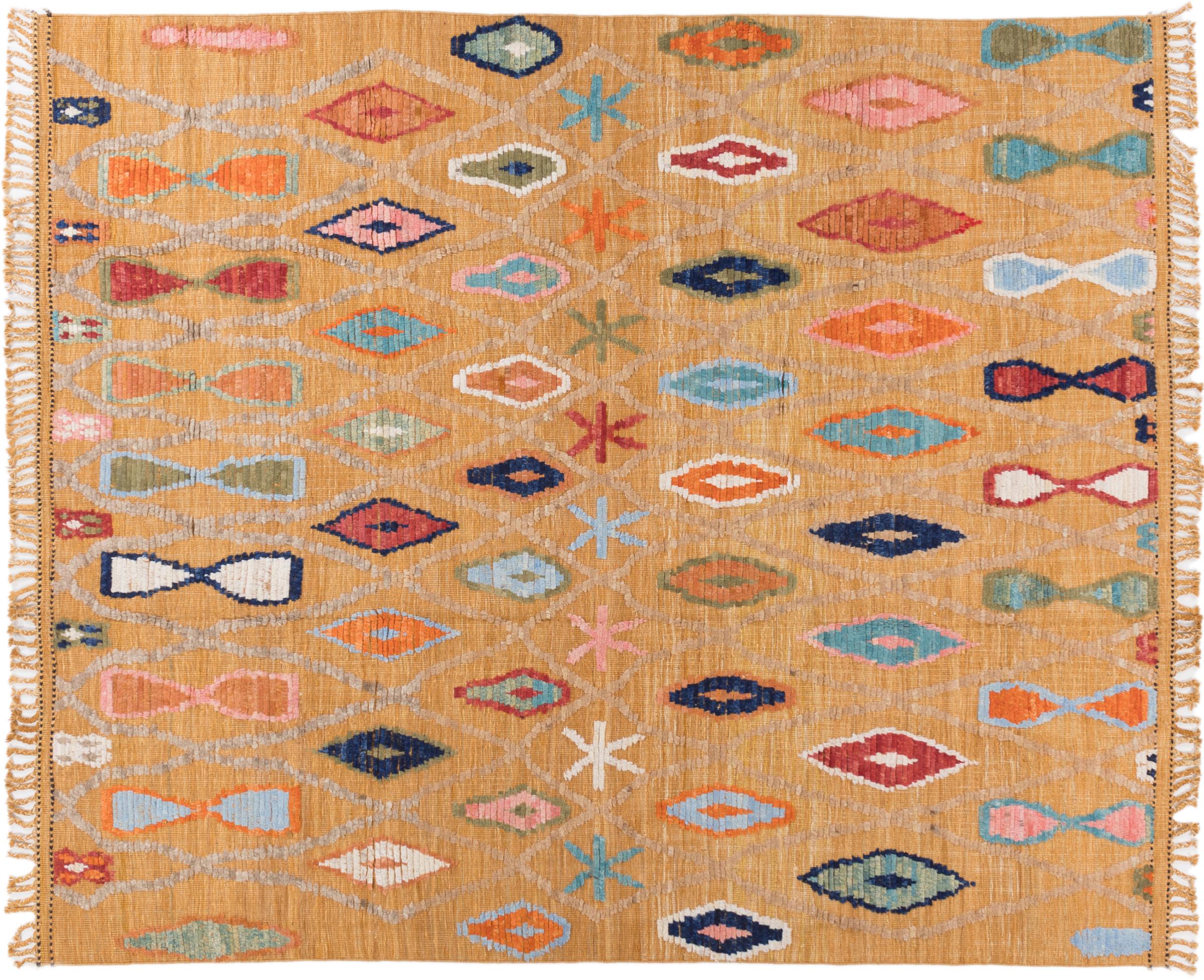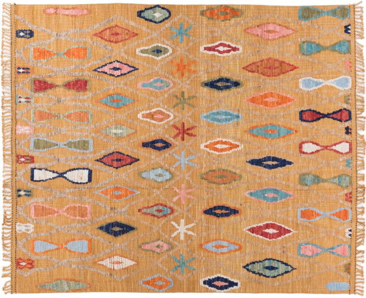 This rug was made as a flat weave by hand on a loom. Flatweave is the term used to describe rugs that have no pile. As the name promises, these rugs are woven and not knotted. This results in a flat rug with a structured surface. Flatweaves are not as soft and usually thinner than knotted rugs. At the same time they are much less complex to manufacture and can usually be laid out from both sides (front and back). Their patterns are usually geometric, which is determined by the fabric.