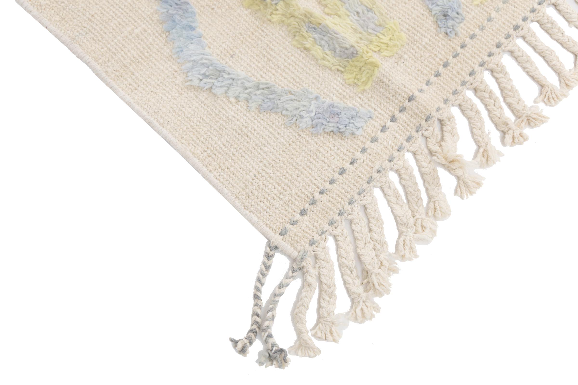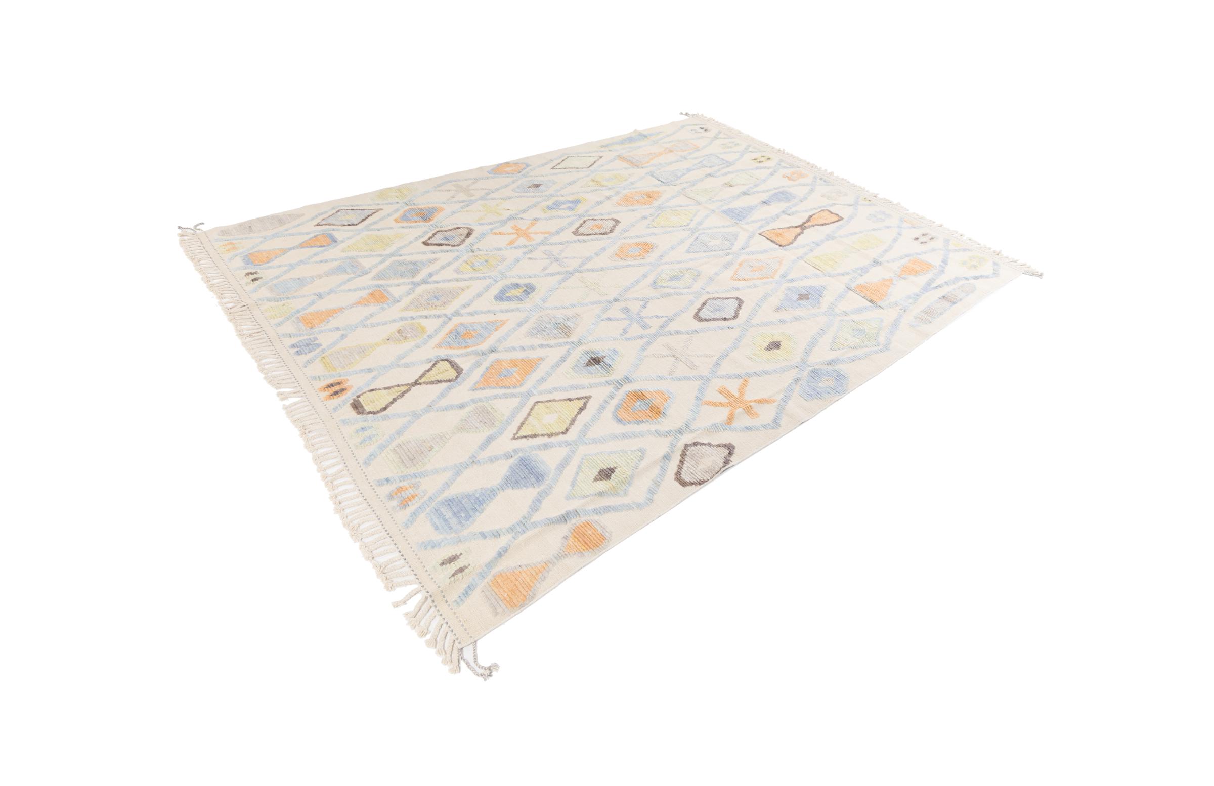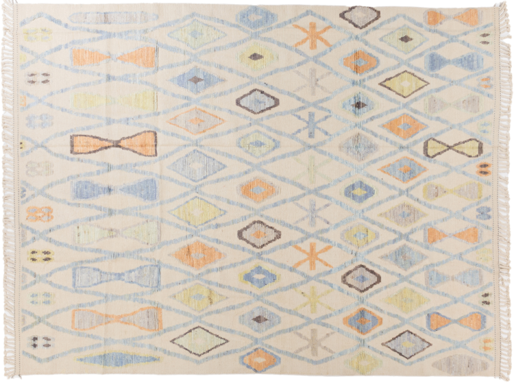 This rug was made as a flat weave by hand on a loom. Flatweave is the term used to describe rugs that have no pile. As the name promises, these rugs are woven and not knotted. This results in a flat rug with a structured surface. Flatweaves are not as soft and usually thinner than knotted rugs. At the same time they are much less complex to manufacture and can usually be laid out from both sides (front and back). Their patterns are usually geometric, which is determined by the fabric.
