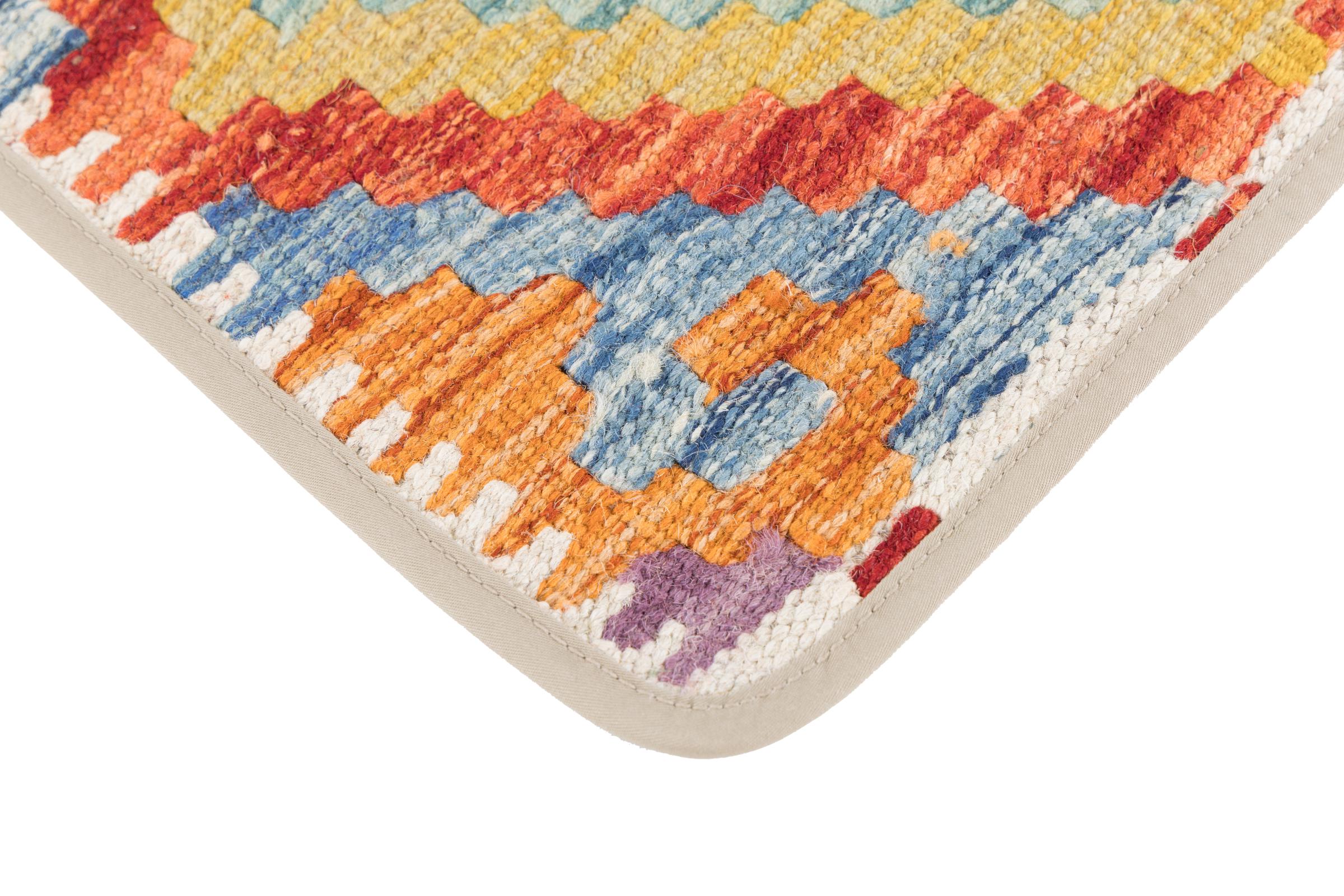 This handwoven Kilim Afghan is a wonderful and unique piece of art. Hard to believe that these modern colours and patterns have already been used centuries ago. This carpet has been woven by hand in old tradition in Afghanistan. It delivers a portion of contemporary history, which you won't find in this specific design a second time. It consists of high-grade natural wool and gives your home a personalised touch.