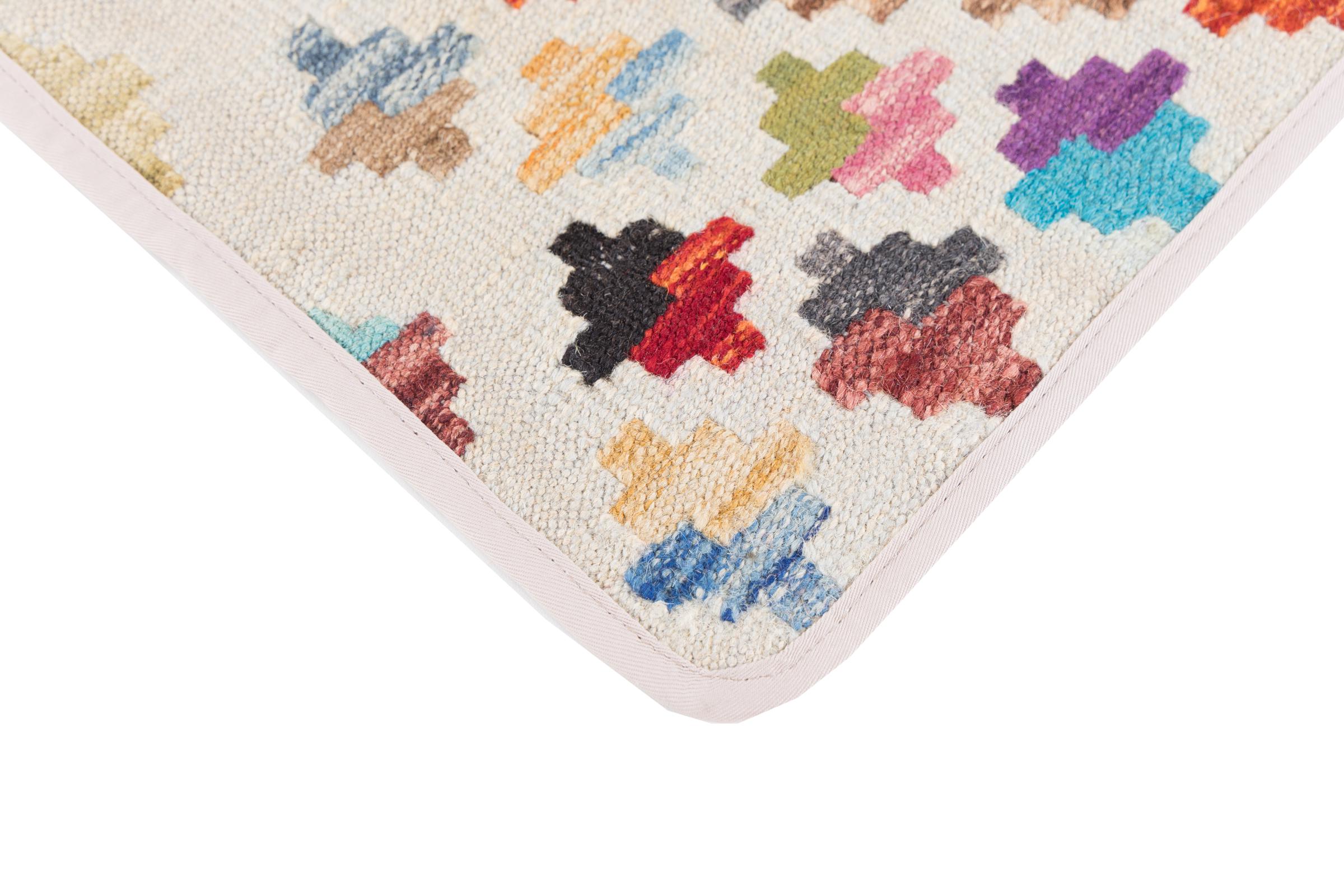 This handwoven Kilim Afghan is a wonderful and unique piece of art. Hard to believe that these modern colours and patterns have already been used centuries ago. This carpet has been woven by hand in old tradition in Afghanistan. It delivers a portion of contemporary history, which you won't find in this specific design a second time. It consists of high-grade natural wool and gives your home a personalised touch.