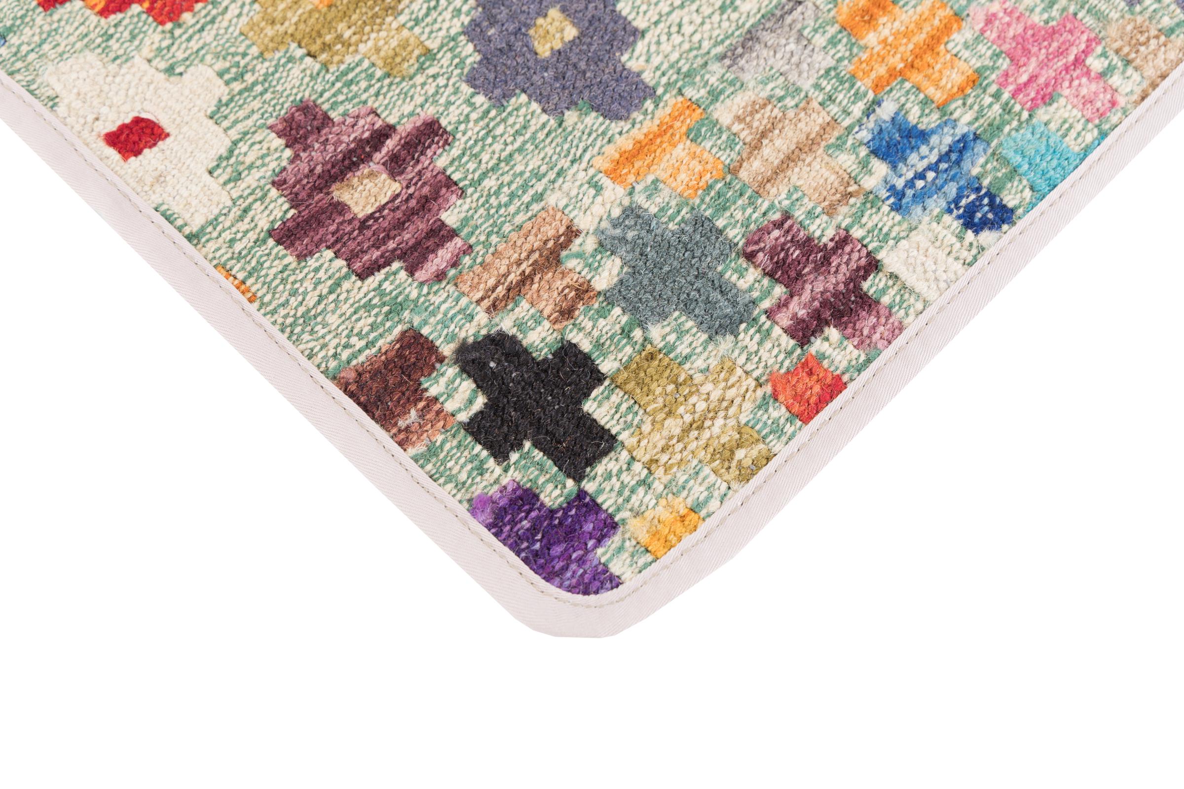 This handwoven Kilim Afghan is a wonderful and unique piece of art. Hard to believe that these modern colours and patterns have already been used centuries ago. This carpet has been woven by hand in old tradition in Afghanistan. It delivers a portion of contemporary history, which you won't find in this specific design a second time. It consists of high-grade natural wool and gives your home a personalised touch.