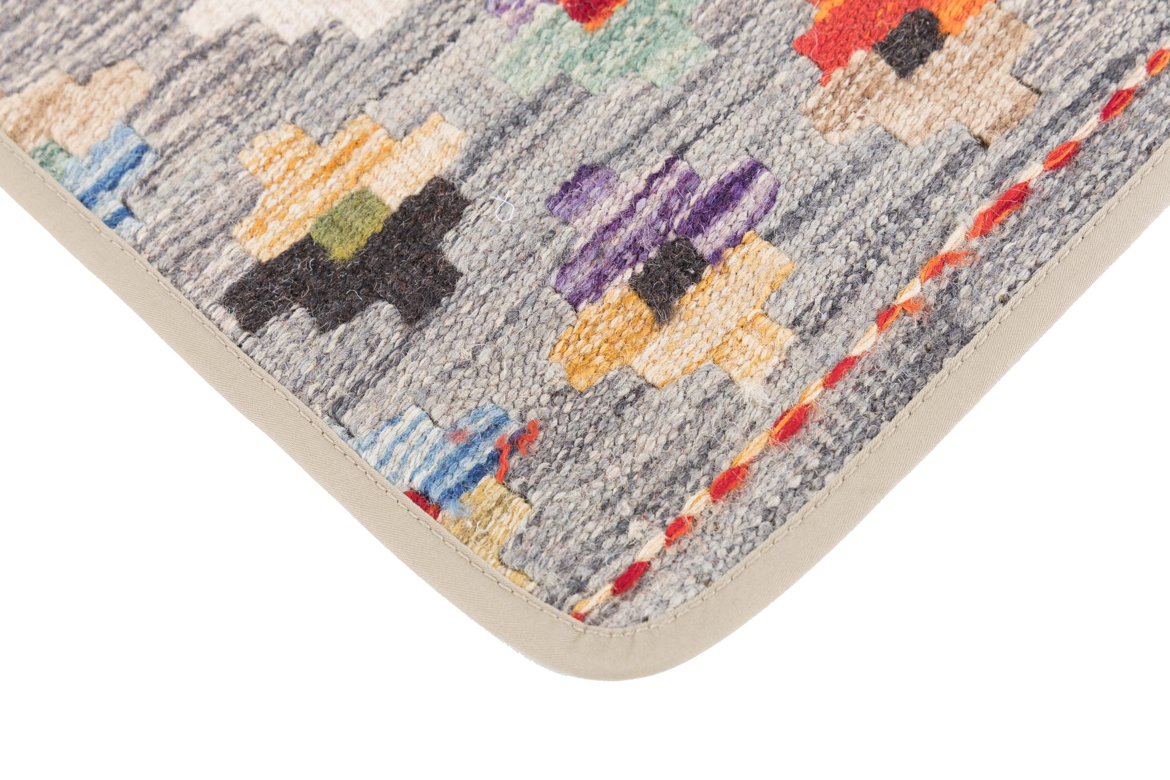 This handwoven Kilim Afghan is a wonderful and unique piece of art. Hard to believe that these modern colours and patterns have already been used centuries ago. This carpet has been woven by hand in old tradition in Afghanistan. It delivers a portion of contemporary history, which you won't find in this specific design a second time. It consists of high-grade natural wool and gives your home a personalised touch.