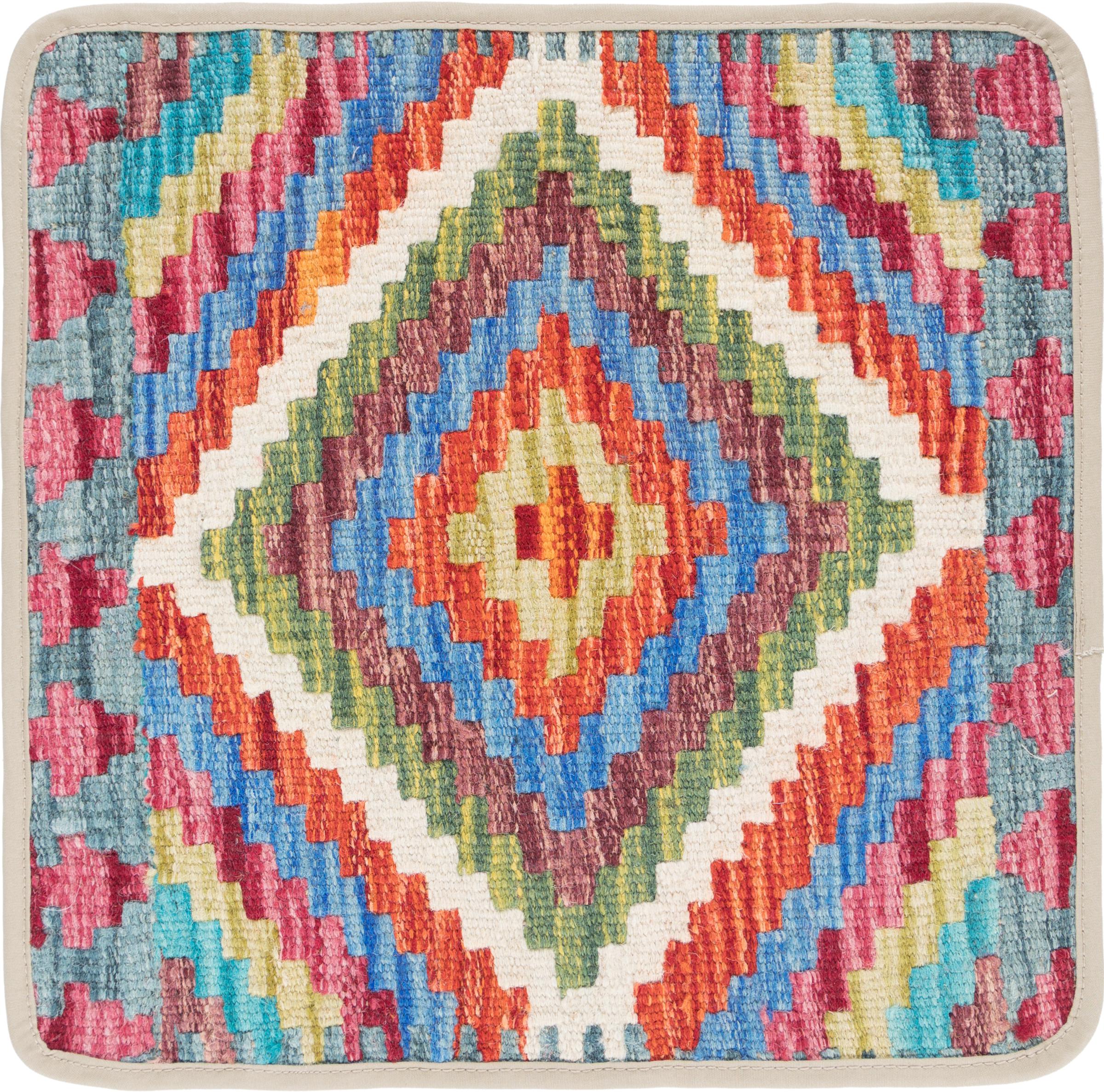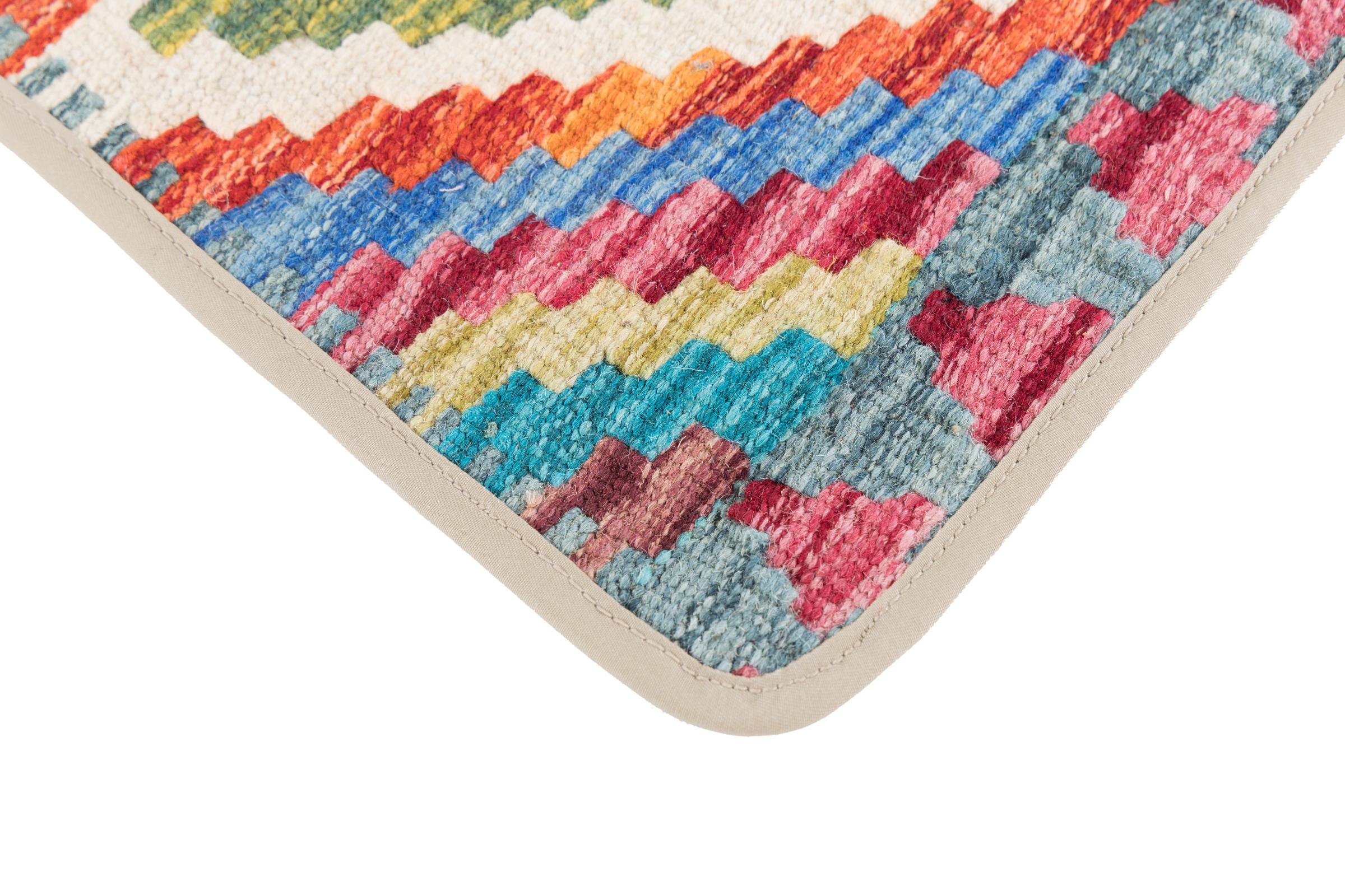 This handwoven Kilim Afghan is a wonderful and unique piece of art. Hard to believe that these modern colours and patterns have already been used centuries ago. This carpet has been woven by hand in old tradition in Afghanistan. It delivers a portion of contemporary history, which you won't find in this specific design a second time. It consists of high-grade natural wool and gives your home a personalised touch.