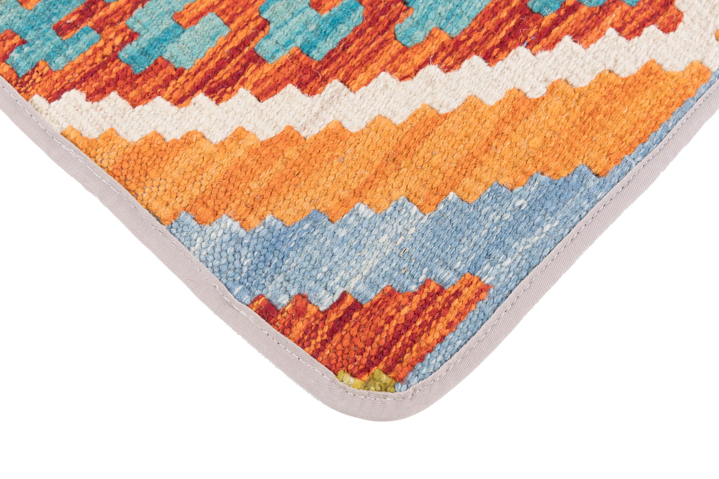 This handwoven Kilim Afghan is a wonderful and unique piece of art. Hard to believe that these modern colours and patterns have already been used centuries ago. This carpet has been woven by hand in old tradition in Afghanistan. It delivers a portion of contemporary history, which you won't find in this specific design a second time. It consists of high-grade natural wool and gives your home a personalised touch.