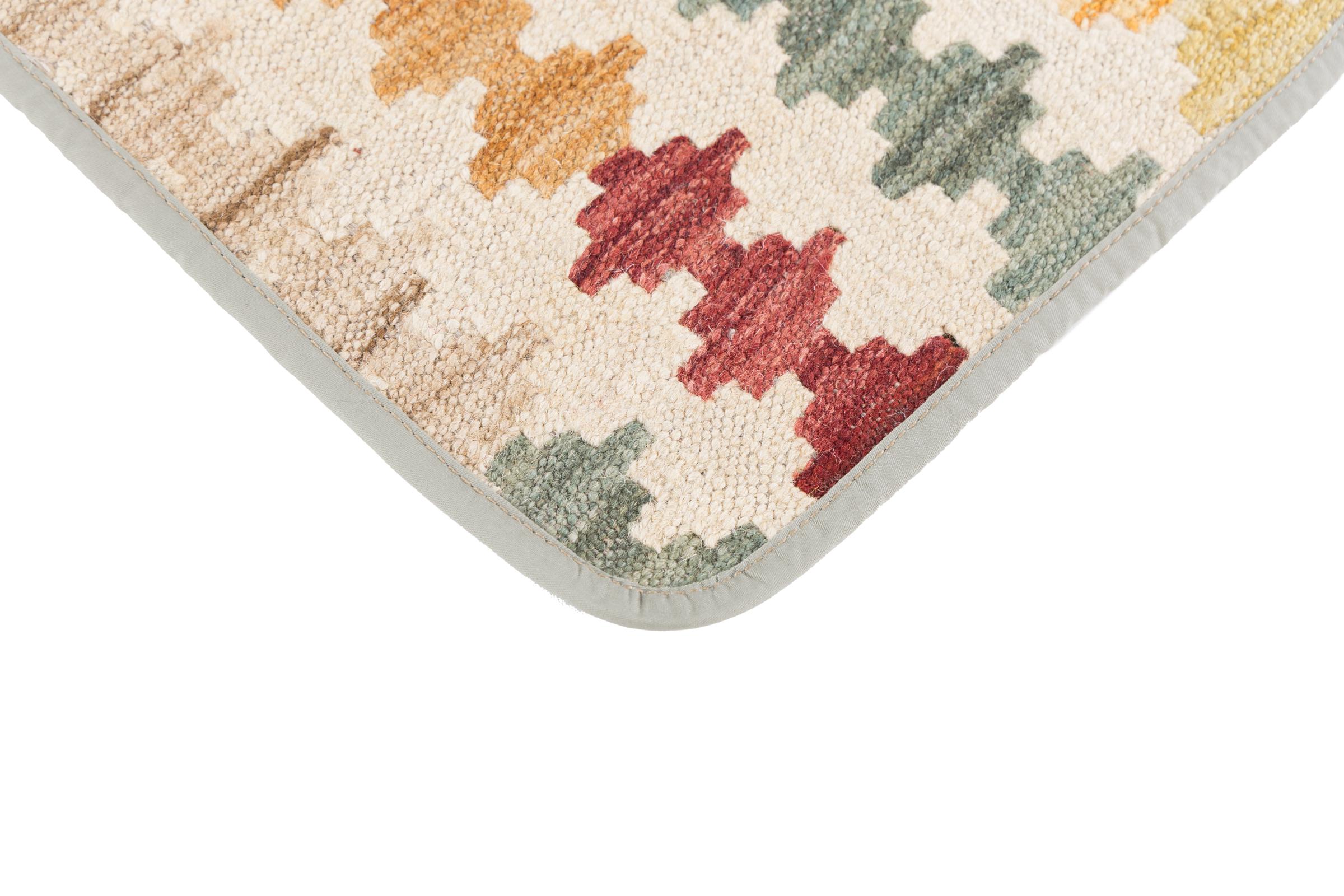 This handwoven Kilim Afghan is a wonderful and unique piece of art. Hard to believe that these modern colours and patterns have already been used centuries ago. This carpet has been woven by hand in old tradition in Afghanistan. It delivers a portion of contemporary history, which you won't find in this specific design a second time. It consists of high-grade natural wool and gives your home a personalised touch.