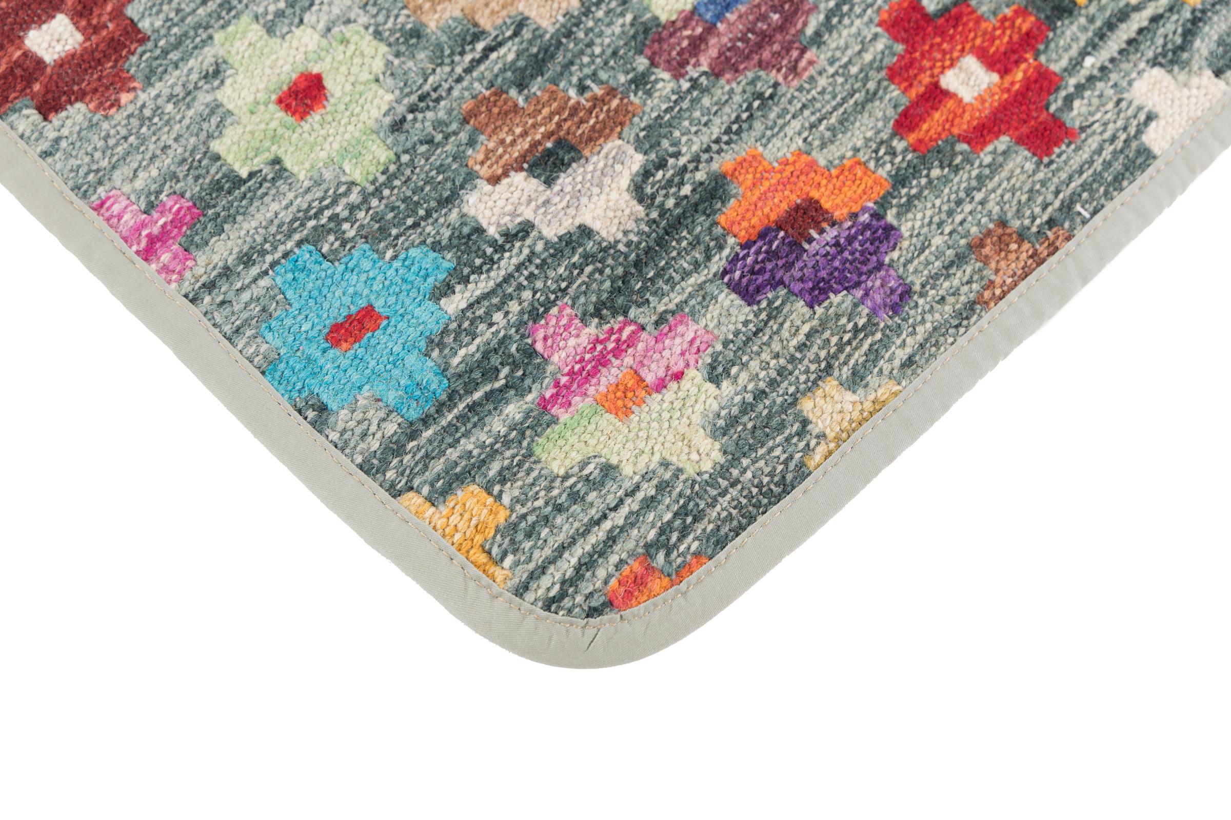 This handwoven Kilim Afghan is a wonderful and unique piece of art. Hard to believe that these modern colours and patterns have already been used centuries ago. This carpet has been woven by hand in old tradition in Afghanistan. It delivers a portion of contemporary history, which you won't find in this specific design a second time. It consists of high-grade natural wool and gives your home a personalised touch.