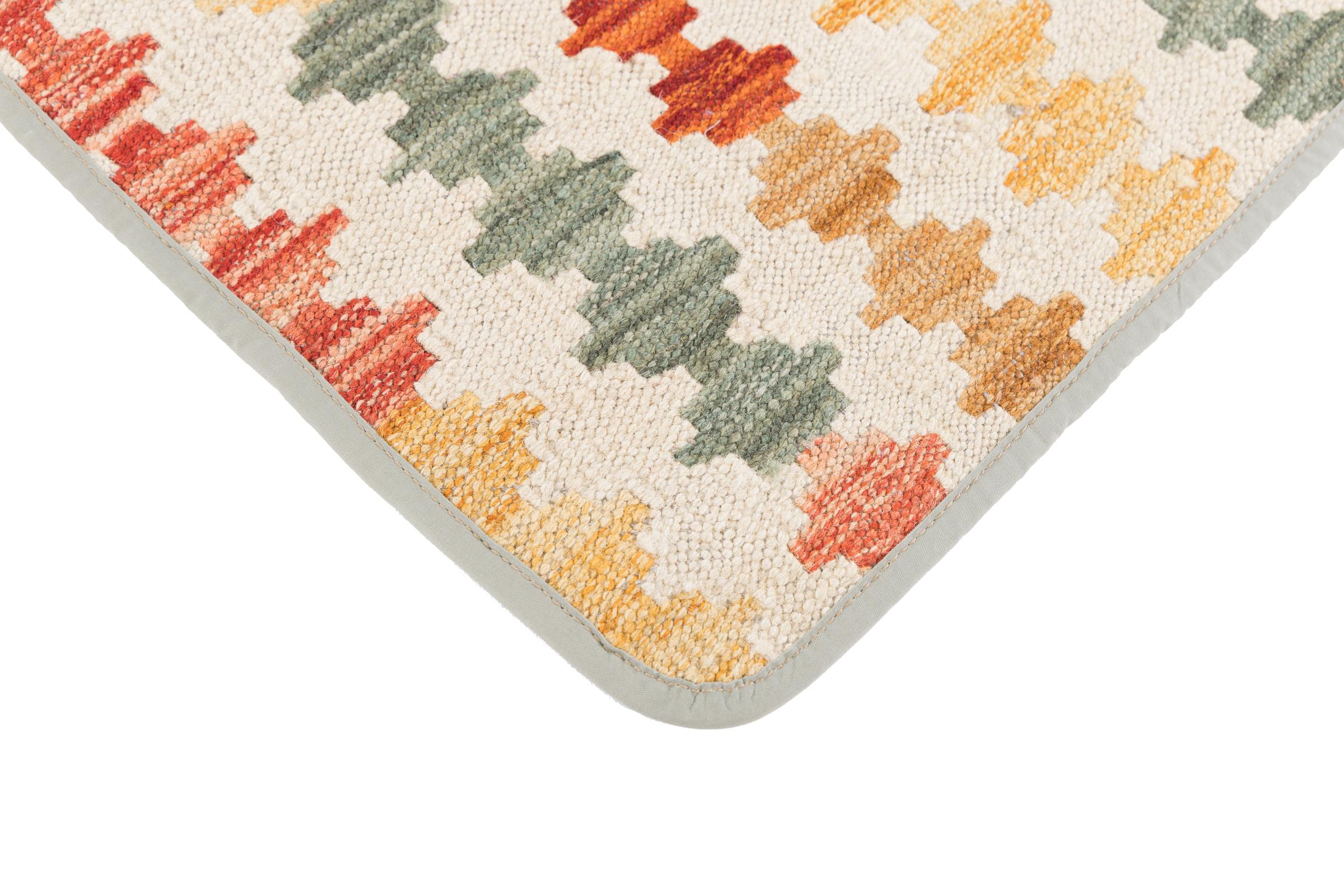 This handwoven Kilim Afghan is a wonderful and unique piece of art. Hard to believe that these modern colours and patterns have already been used centuries ago. This carpet has been woven by hand in old tradition in Afghanistan. It delivers a portion of contemporary history, which you won't find in this specific design a second time. It consists of high-grade natural wool and gives your home a personalised touch.