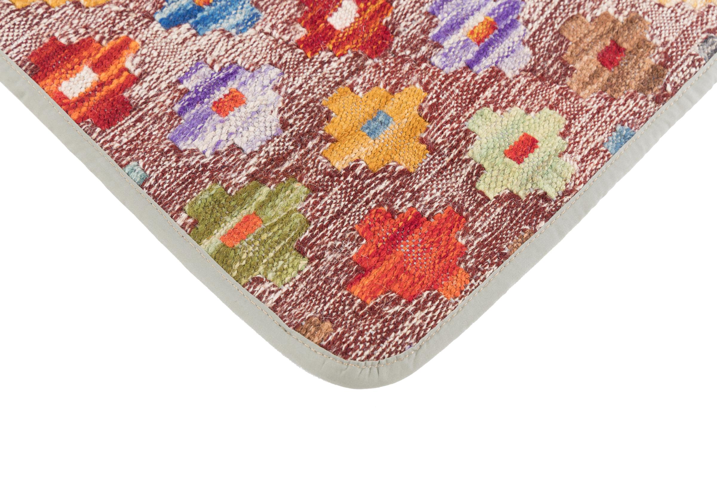 This handwoven Kilim Afghan is a wonderful and unique piece of art. Hard to believe that these modern colours and patterns have already been used centuries ago. This carpet has been woven by hand in old tradition in Afghanistan. It delivers a portion of contemporary history, which you won't find in this specific design a second time. It consists of high-grade natural wool and gives your home a personalised touch.