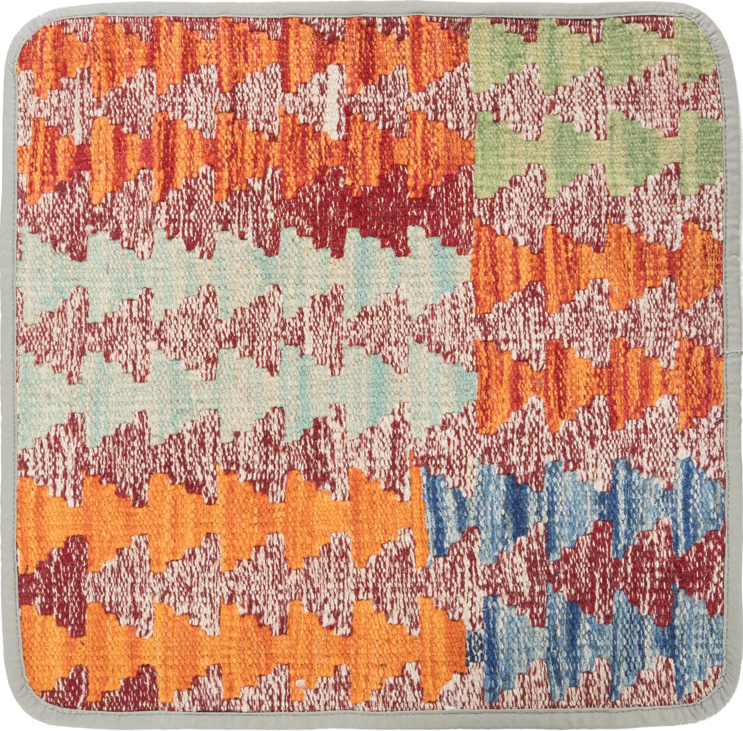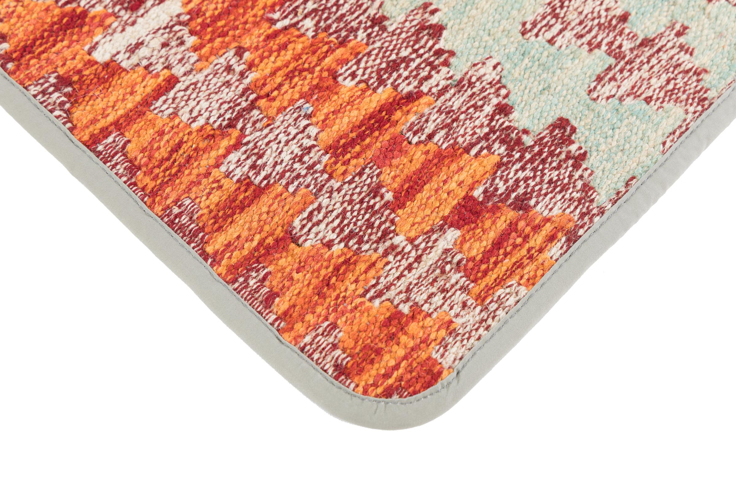This handwoven Kilim Afghan is a wonderful and unique piece of art. Hard to believe that these modern colours and patterns have already been used centuries ago. This carpet has been woven by hand in old tradition in Afghanistan. It delivers a portion of contemporary history, which you won't find in this specific design a second time. It consists of high-grade natural wool and gives your home a personalised touch.