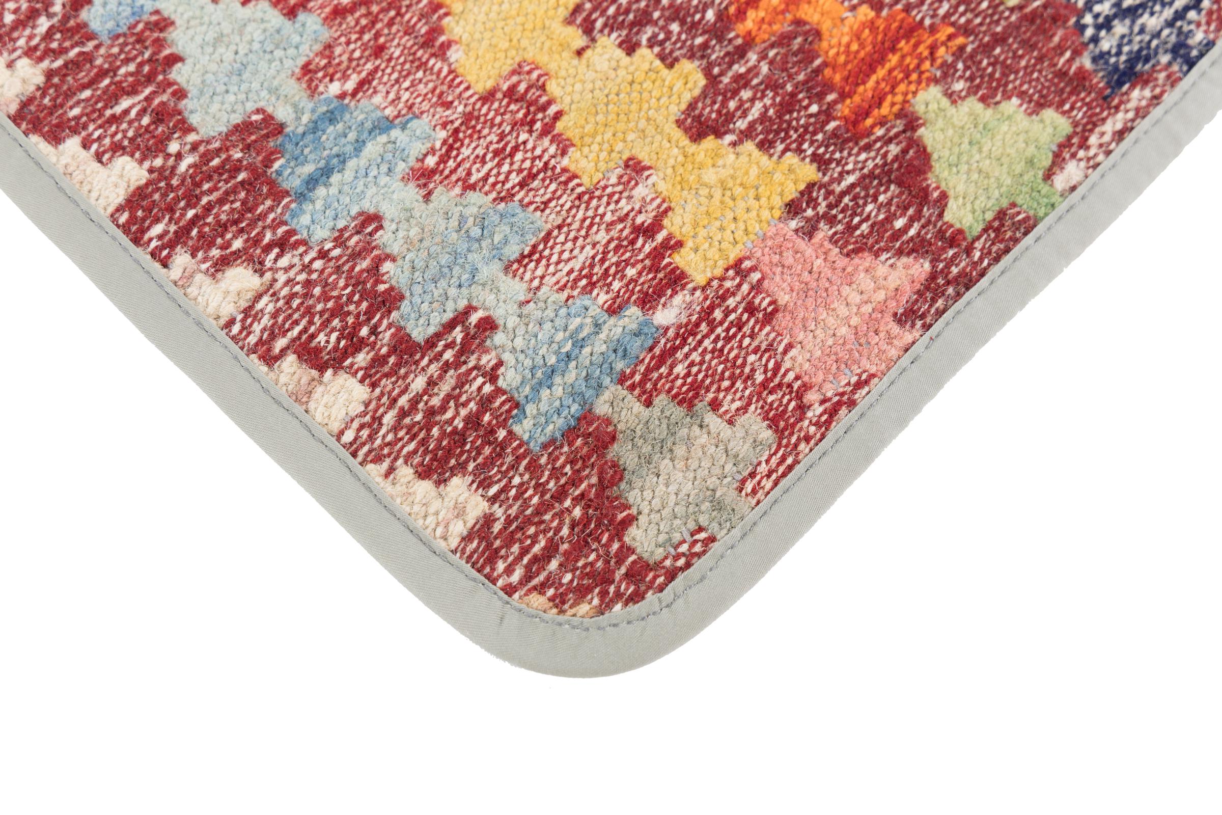 This handwoven Kilim Afghan is a wonderful and unique piece of art. Hard to believe that these modern colours and patterns have already been used centuries ago. This carpet has been woven by hand in old tradition in Afghanistan. It delivers a portion of contemporary history, which you won't find in this specific design a second time. It consists of high-grade natural wool and gives your home a personalised touch.