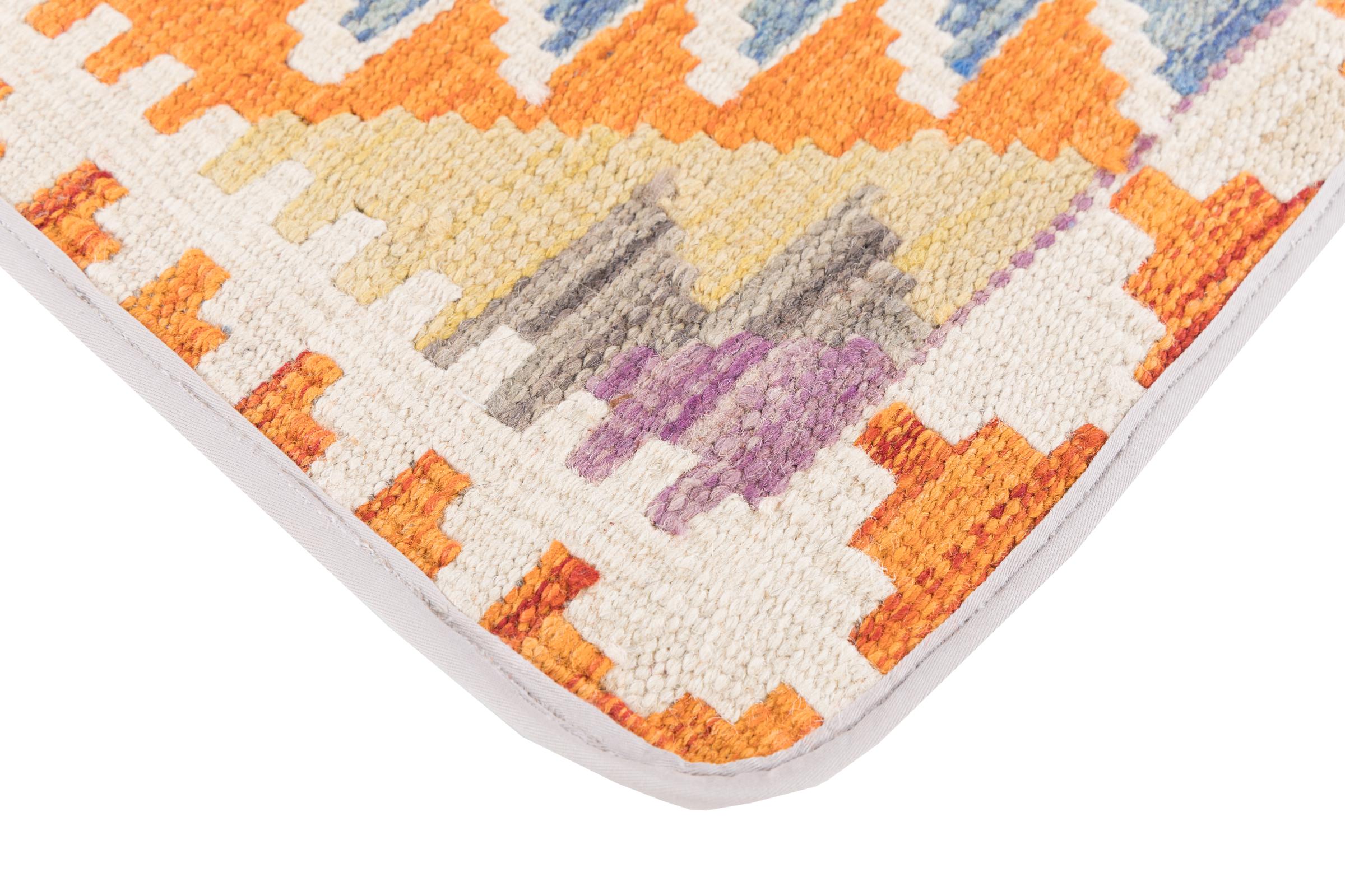 This handwoven Kilim Afghan is a wonderful and unique piece of art. Hard to believe that these modern colours and patterns have already been used centuries ago. This carpet has been woven by hand in old tradition in Afghanistan. It delivers a portion of contemporary history, which you won't find in this specific design a second time. It consists of high-grade natural wool and gives your home a personalised touch.
