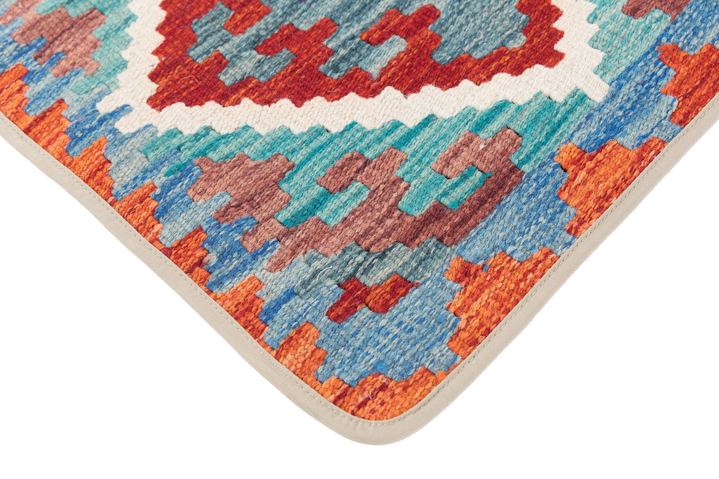 This handwoven Kilim Afghan is a wonderful and unique piece of art. Hard to believe that these modern colours and patterns have already been used centuries ago. This carpet has been woven by hand in old tradition in Afghanistan. It delivers a portion of contemporary history, which you won't find in this specific design a second time. It consists of high-grade natural wool and gives your home a personalised touch.