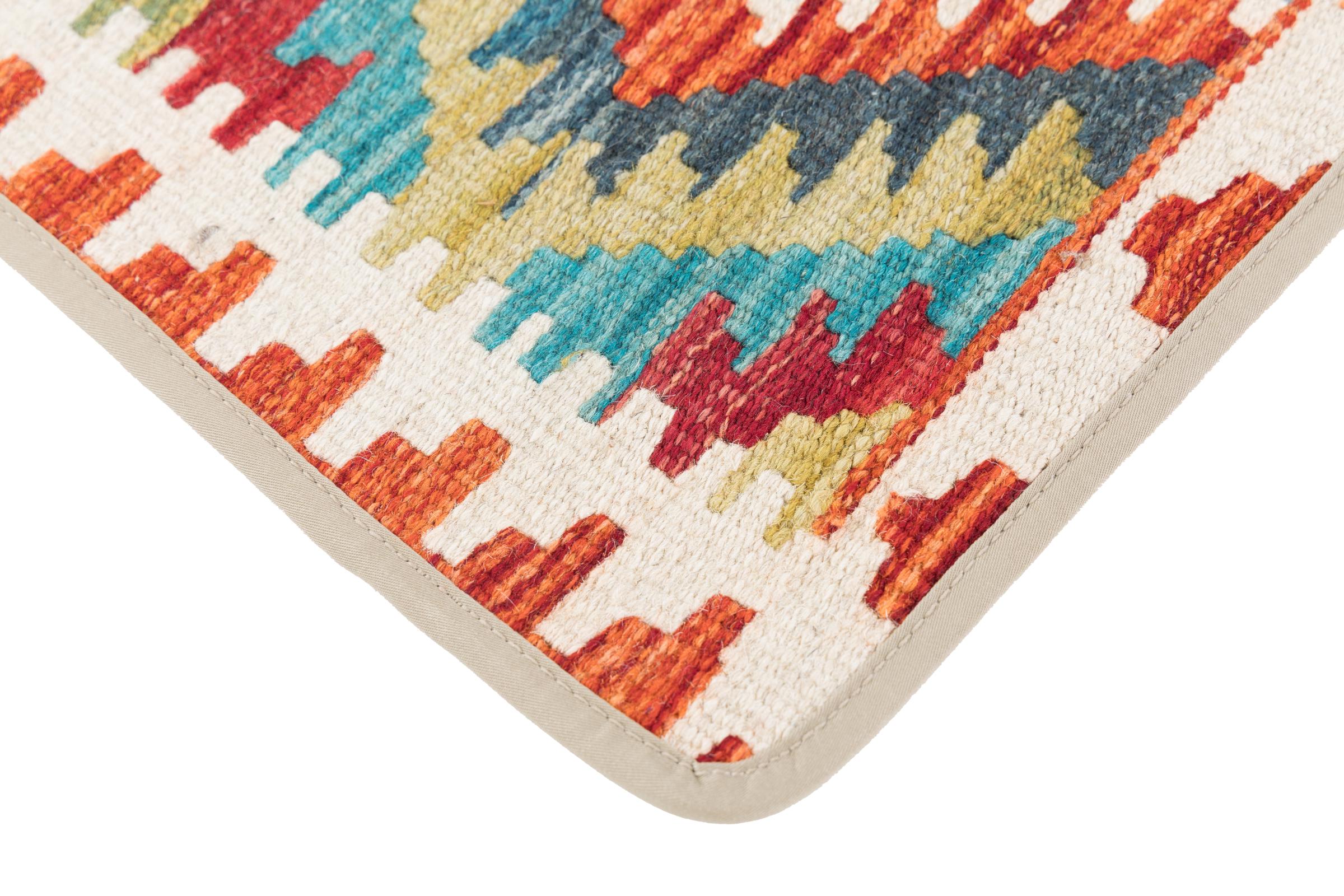 This handwoven Kilim Afghan is a wonderful and unique piece of art. Hard to believe that these modern colours and patterns have already been used centuries ago. This carpet has been woven by hand in old tradition in Afghanistan. It delivers a portion of contemporary history, which you won't find in this specific design a second time. It consists of high-grade natural wool and gives your home a personalised touch.