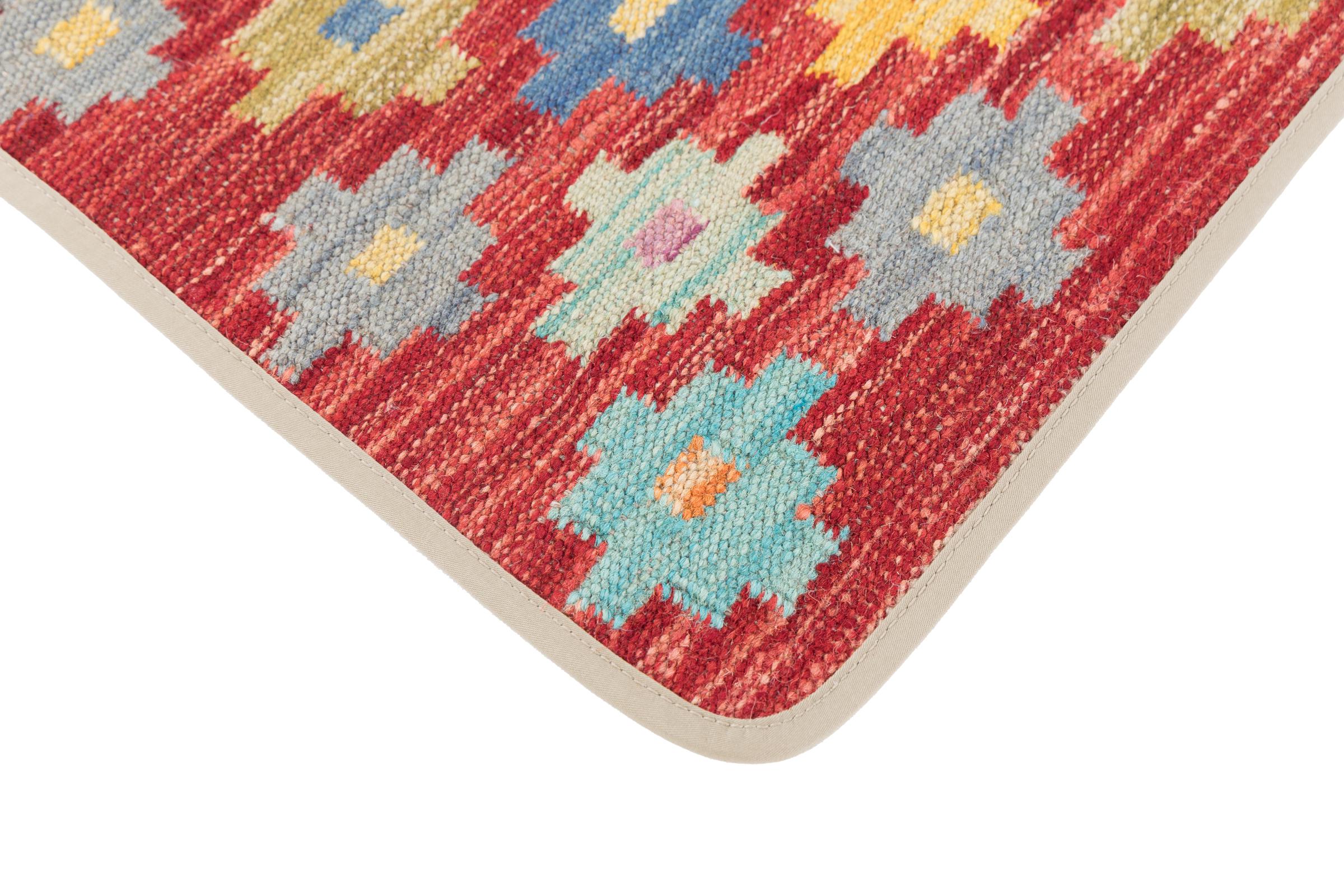 This handwoven Kilim Afghan is a wonderful and unique piece of art. Hard to believe that these modern colours and patterns have already been used centuries ago. This carpet has been woven by hand in old tradition in Afghanistan. It delivers a portion of contemporary history, which you won't find in this specific design a second time. It consists of high-grade natural wool and gives your home a personalised touch.