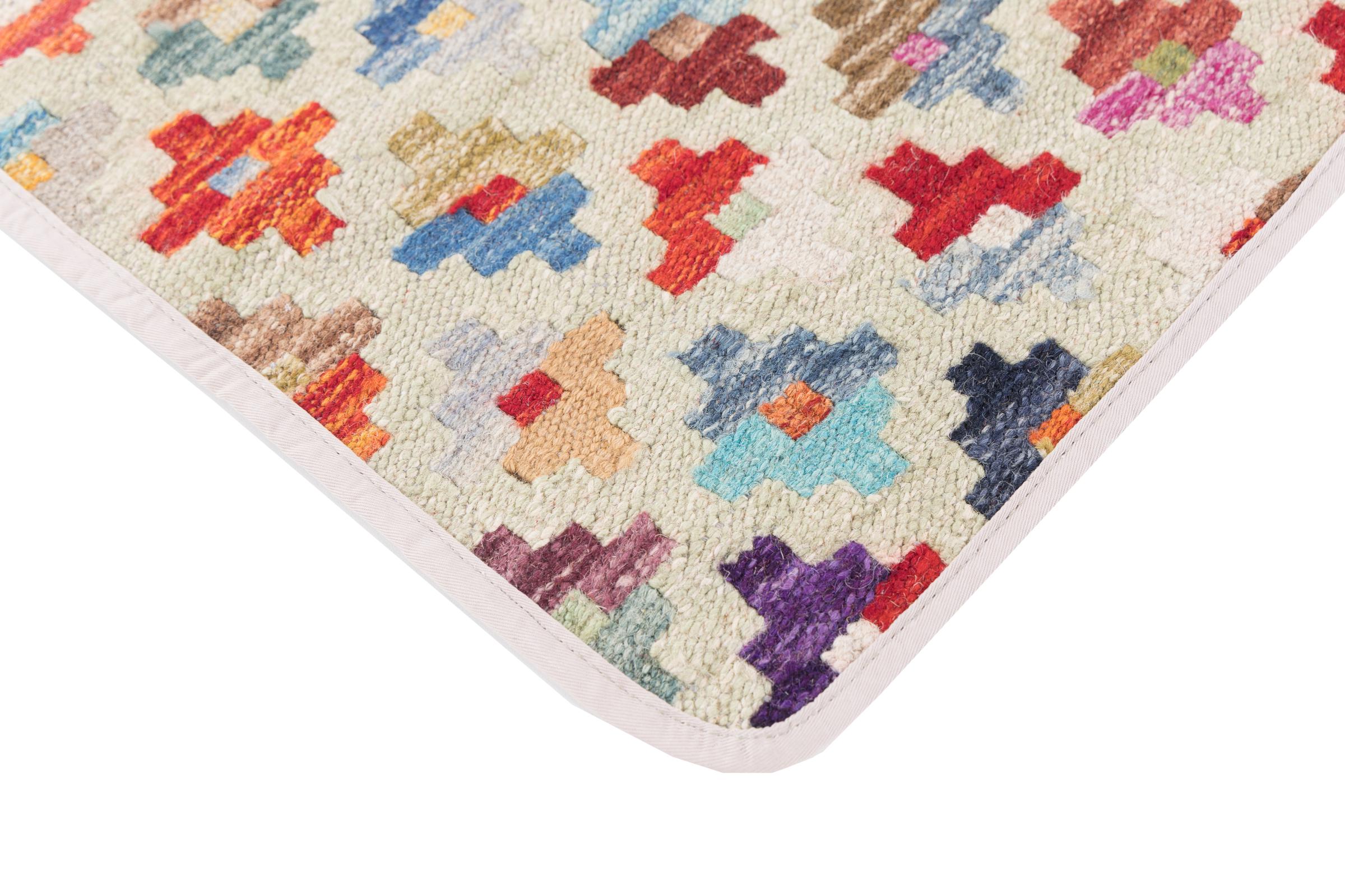 This handwoven Kilim Afghan is a wonderful and unique piece of art. Hard to believe that these modern colours and patterns have already been used centuries ago. This carpet has been woven by hand in old tradition in Afghanistan. It delivers a portion of contemporary history, which you won't find in this specific design a second time. It consists of high-grade natural wool and gives your home a personalised touch.