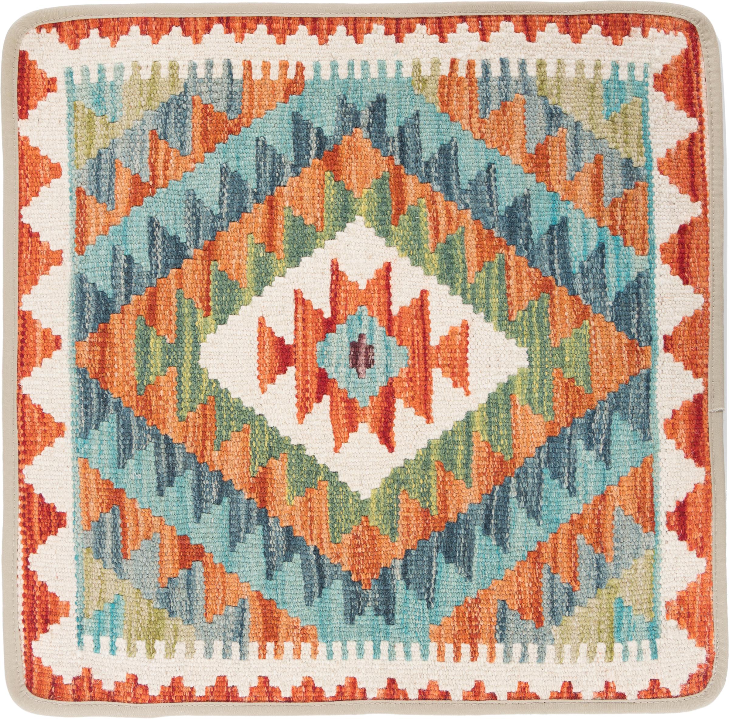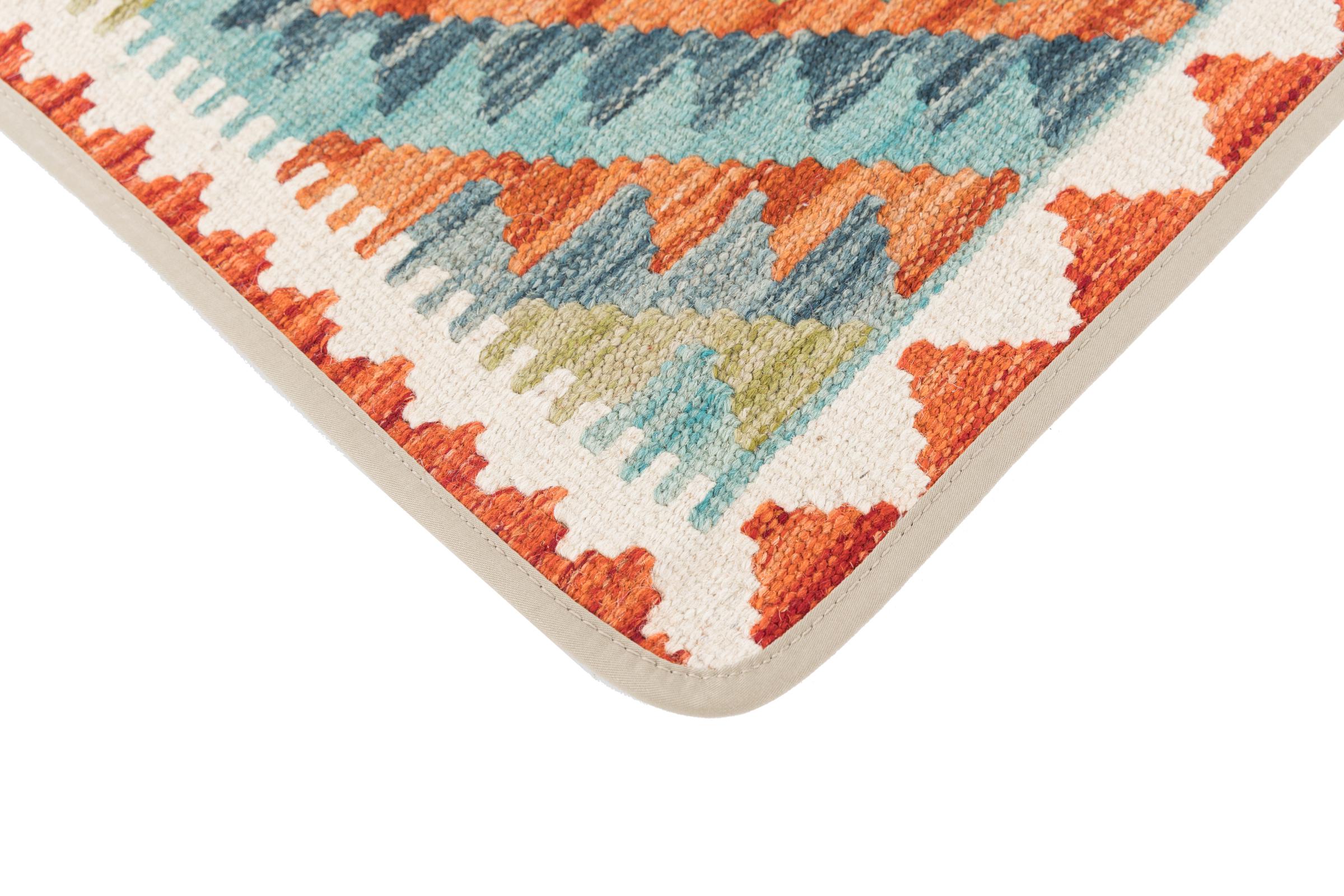 This handwoven Kilim Afghan is a wonderful and unique piece of art. Hard to believe that these modern colours and patterns have already been used centuries ago. This carpet has been woven by hand in old tradition in Afghanistan. It delivers a portion of contemporary history, which you won't find in this specific design a second time. It consists of high-grade natural wool and gives your home a personalised touch.