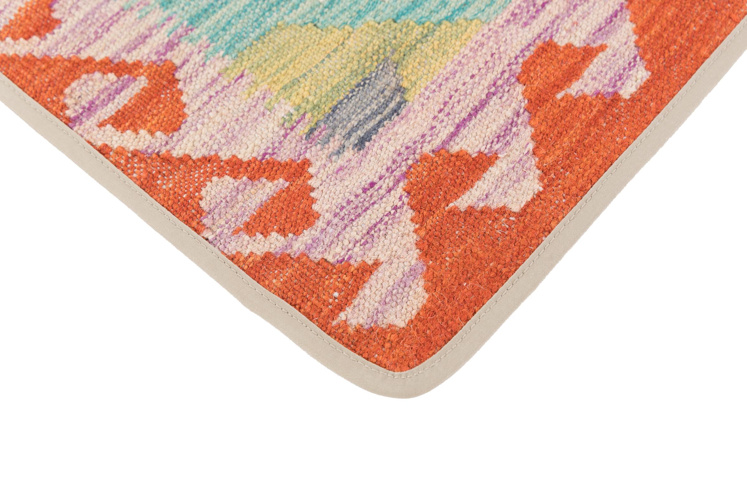 This handwoven Kilim Afghan is a wonderful and unique piece of art. Hard to believe that these modern colours and patterns have already been used centuries ago. This carpet has been woven by hand in old tradition in Afghanistan. It delivers a portion of contemporary history, which you won't find in this specific design a second time. It consists of high-grade natural wool and gives your home a personalised touch.