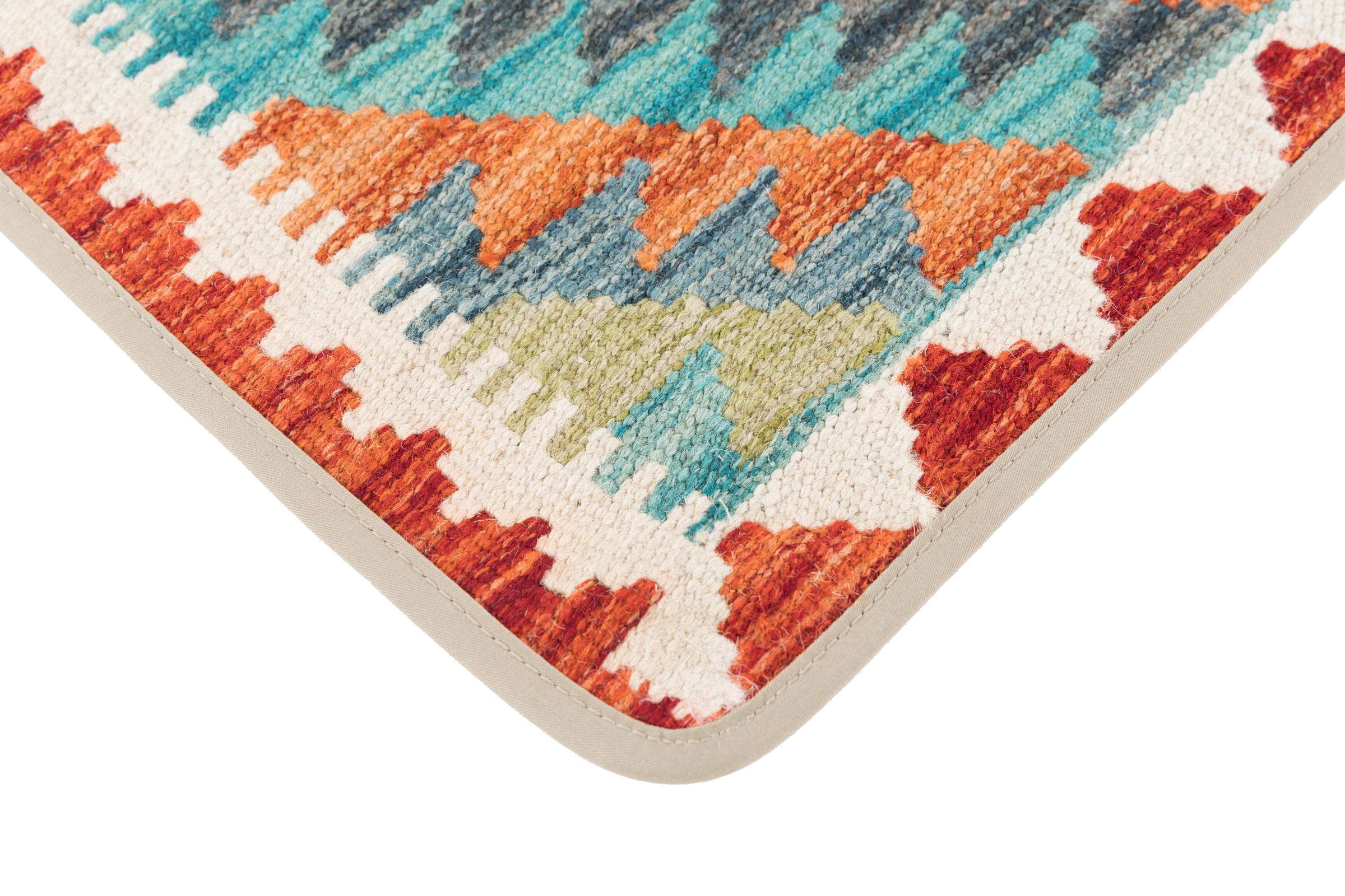 This handwoven Kilim Afghan is a wonderful and unique piece of art. Hard to believe that these modern colours and patterns have already been used centuries ago. This carpet has been woven by hand in old tradition in Afghanistan. It delivers a portion of contemporary history, which you won't find in this specific design a second time. It consists of high-grade natural wool and gives your home a personalised touch.