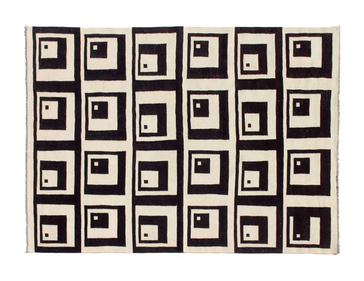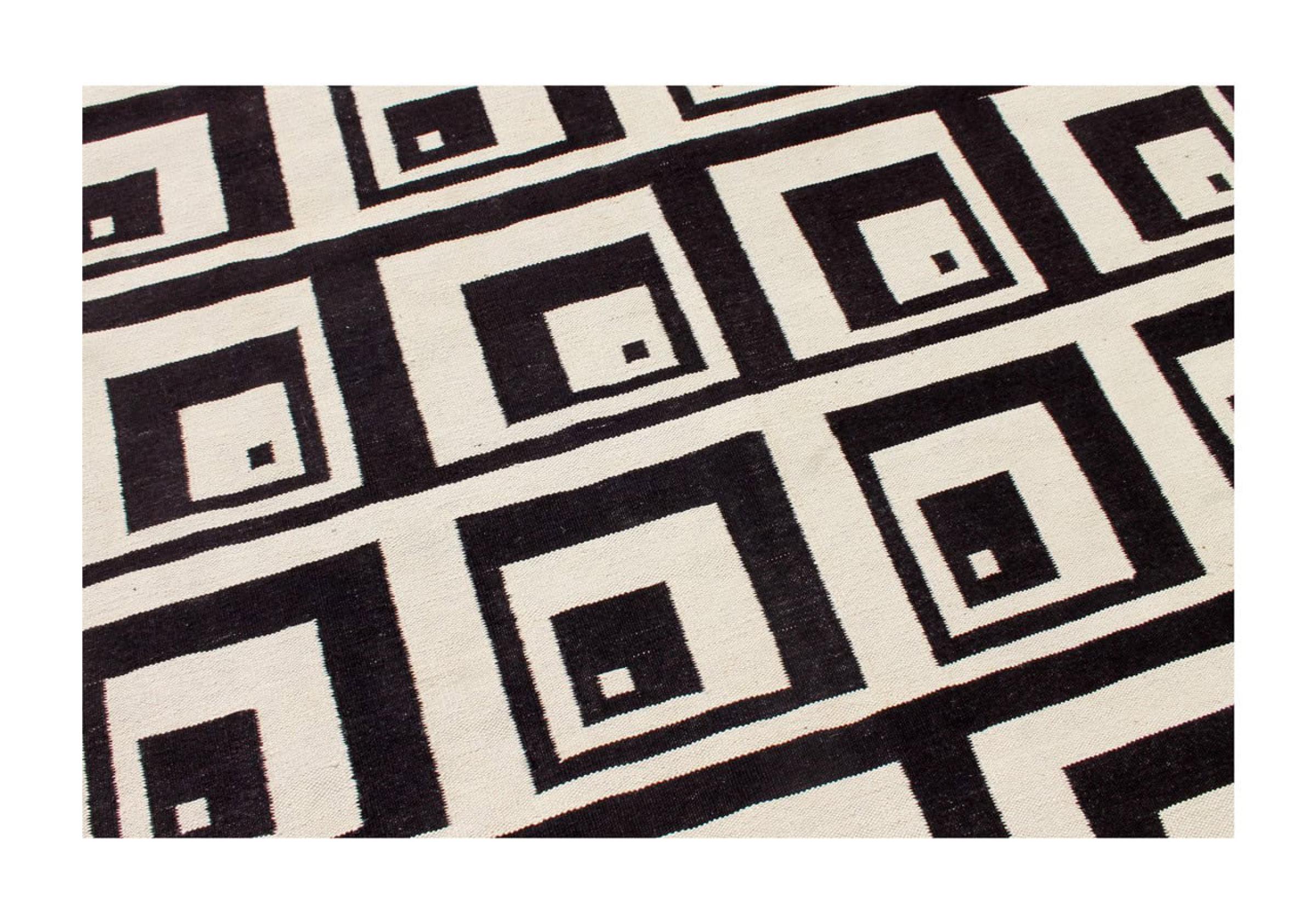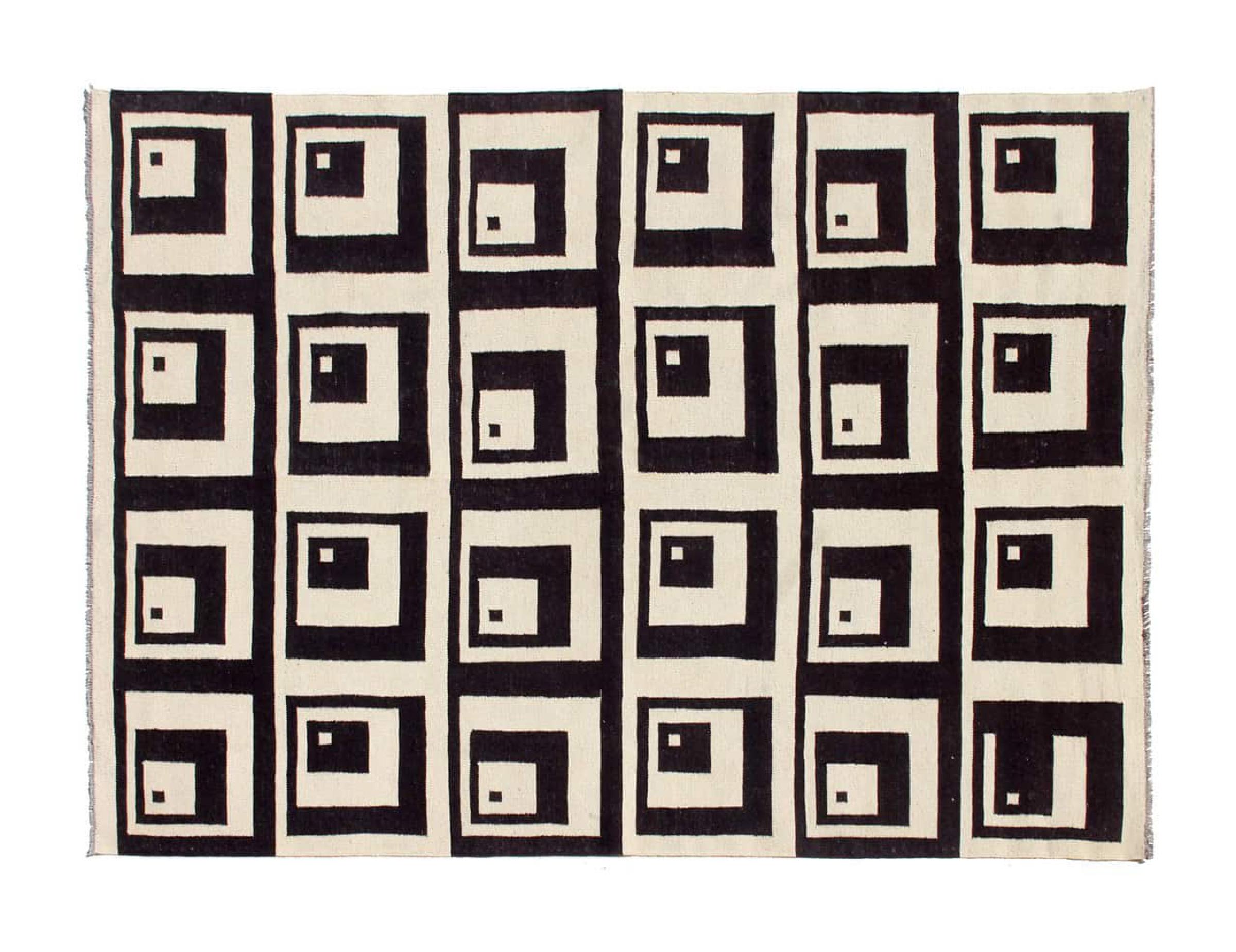 This rug was made as a flat weave by hand on a loom. Flatweave is the term used to describe rugs that have no pile. As the name promises, these rugs are woven and not knotted. This results in a flat rug with a structured surface. Flatweaves are not as soft and usually thinner than knotted rugs. At the same time they are much less complex to manufacture and can usually be laid out from both sides (front and back). Their patterns are usually geometric, which is determined by the fabric.