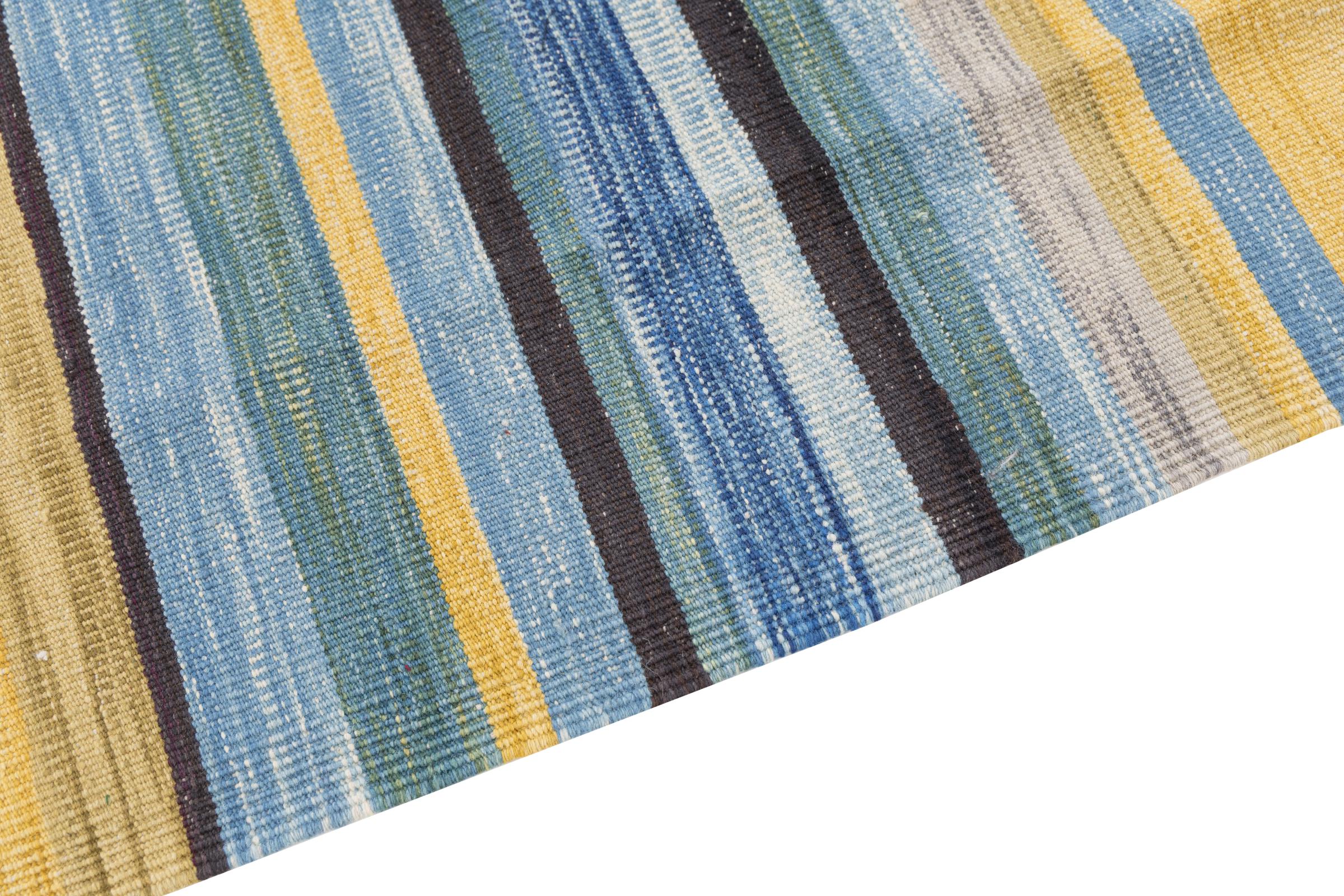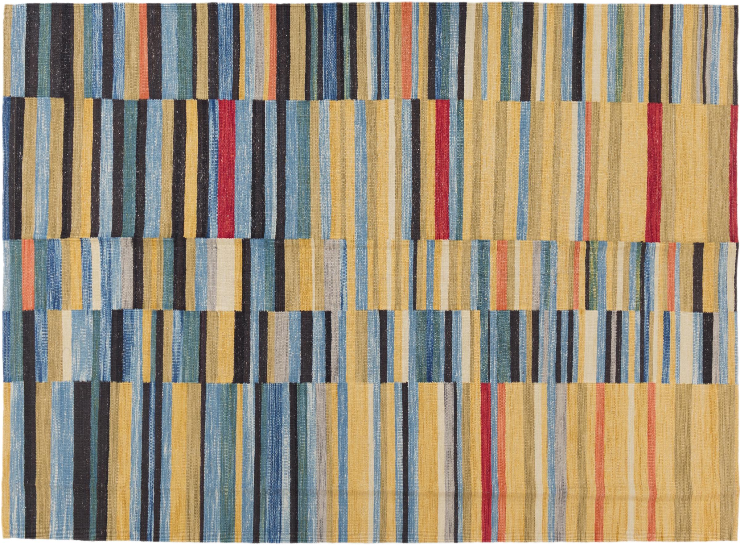 This handwoven Kilim Afghan is a wonderful and unique piece of art. Hard to believe that these modern colours and patterns have already been used centuries ago. This carpet has been woven by hand in old tradition in Afghanistan. It delivers a portion of contemporary history, which you won't find in this specific design a second time. It consists of high-grade natural wool and gives your home a personalised touch.