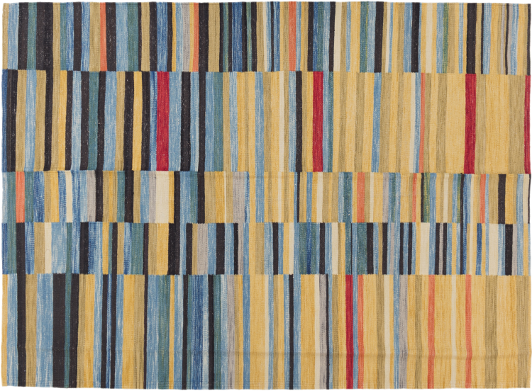 This rug was made as a flat weave by hand on a loom. Flatweave is the term used to describe rugs that have no pile. As the name promises, these rugs are woven and not knotted. This results in a flat rug with a structured surface. Flatweaves are not as soft and usually thinner than knotted rugs. At the same time they are much less complex to manufacture and can usually be laid out from both sides (front and back). Their patterns are usually geometric, which is determined by the fabric.