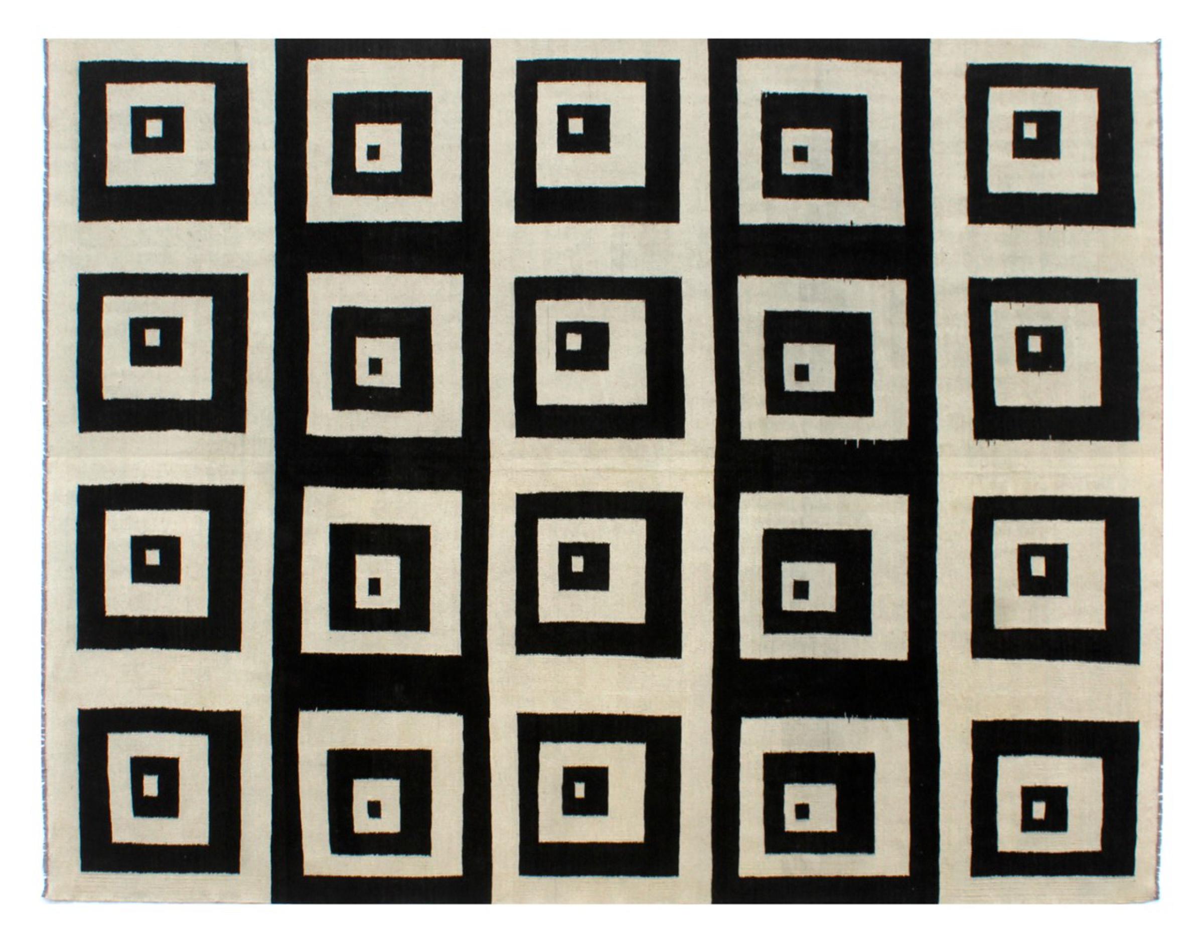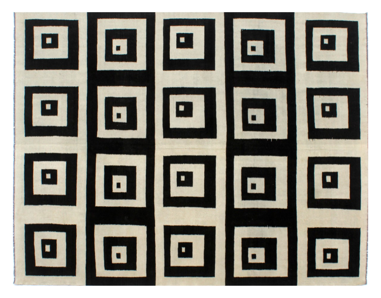 This rug was made as a flat weave by hand on a loom. Flatweave is the term used to describe rugs that have no pile. As the name promises, these rugs are woven and not knotted. This results in a flat rug with a structured surface. Flatweaves are not as soft and usually thinner than knotted rugs. At the same time they are much less complex to manufacture and can usually be laid out from both sides (front and back). Their patterns are usually geometric, which is determined by the fabric.
