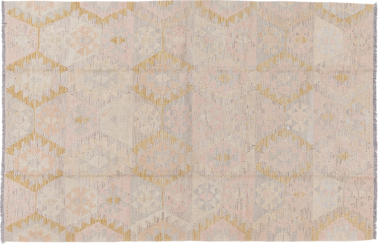 This rug was made as a flat weave by hand on a loom. Flatweave is the term used to describe rugs that have no pile. As the name promises, these rugs are woven and not knotted. This results in a flat rug with a structured surface. Flatweaves are not as soft and usually thinner than knotted rugs. At the same time they are much less complex to manufacture and can usually be laid out from both sides (front and back). Their patterns are usually geometric, which is determined by the fabric.