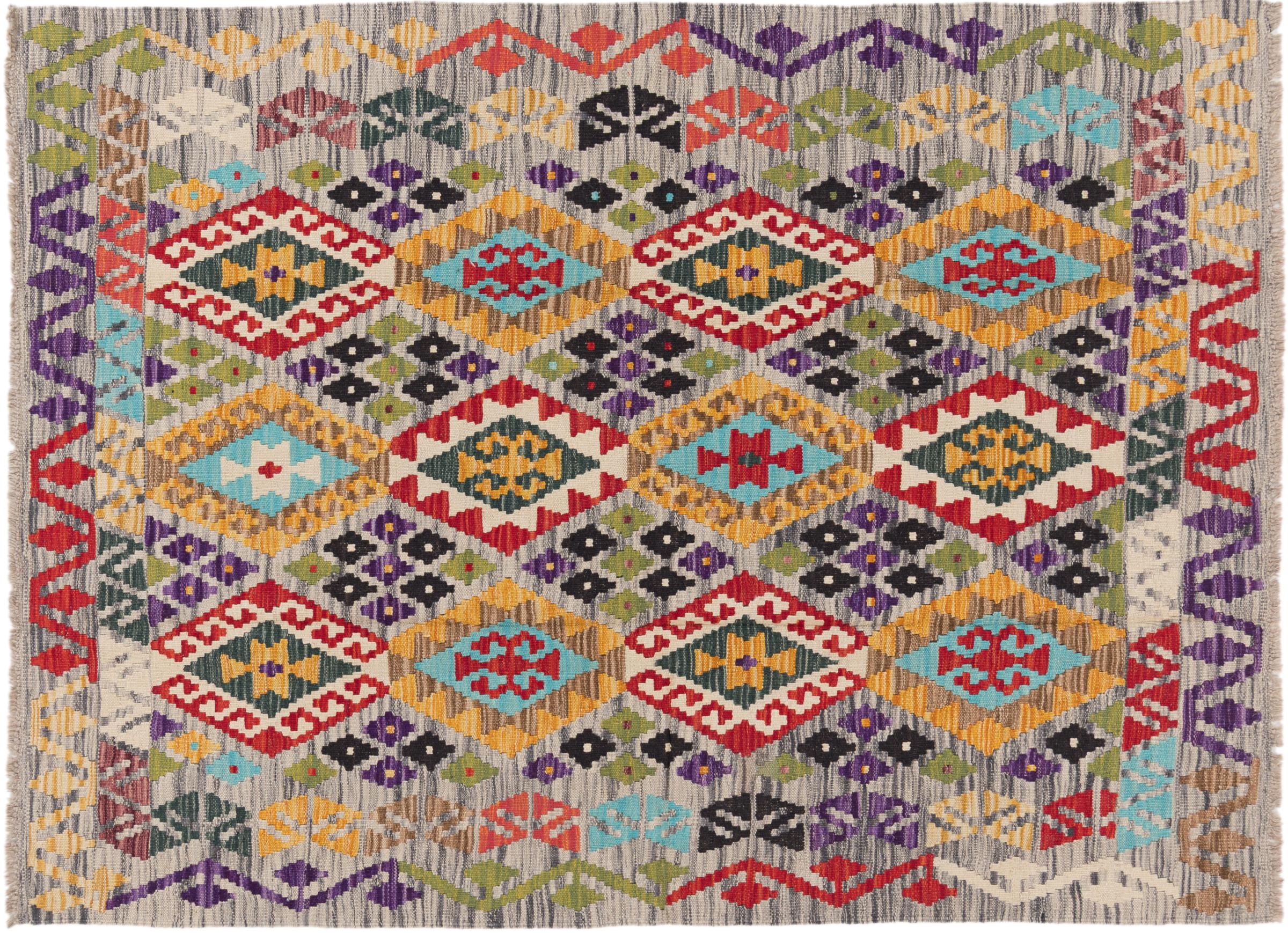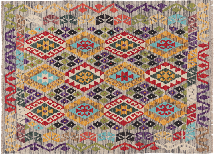 Carpet ID: 2944870045300 Size: 183x137 cm Thickness: ap. 3 mm Manufacturing: Woven by hand Pile: Handspun wool Warp: Sheep wool Origin: Afghanistan Age: New Weight: ap. 4 kg Also know as Kilim, Qilim, Chilim, Afgan, Afghán In stock: Unique - Only 1 in stock