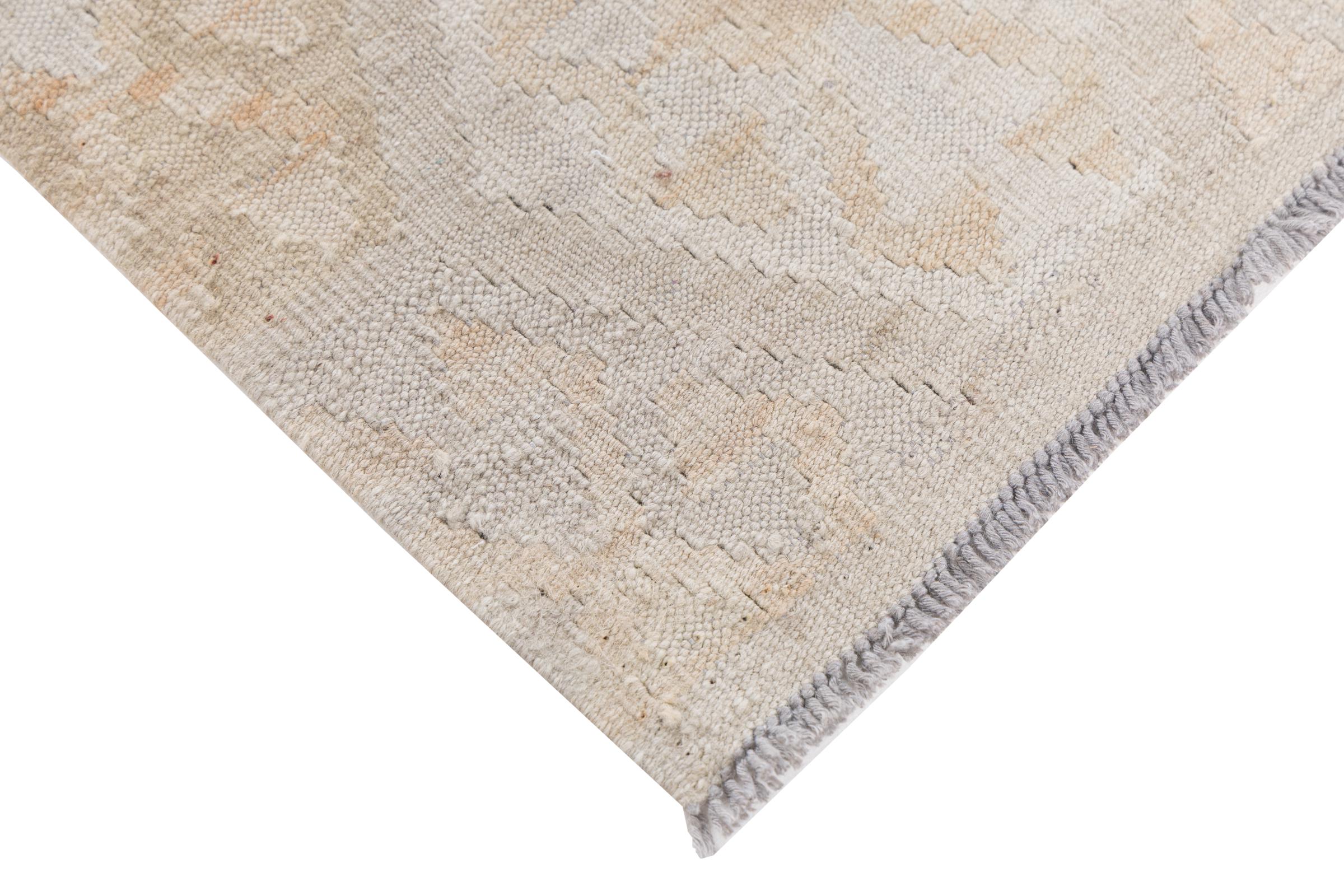This rug was made as a flat weave by hand on a loom. Flatweave is the term used to describe rugs that have no pile. As the name promises, these rugs are woven and not knotted. This results in a flat rug with a structured surface. Flatweaves are not as soft and usually thinner than knotted rugs. At the same time they are much less complex to manufacture and can usually be laid out from both sides (front and back). Their patterns are usually geometric, which is determined by the fabric.