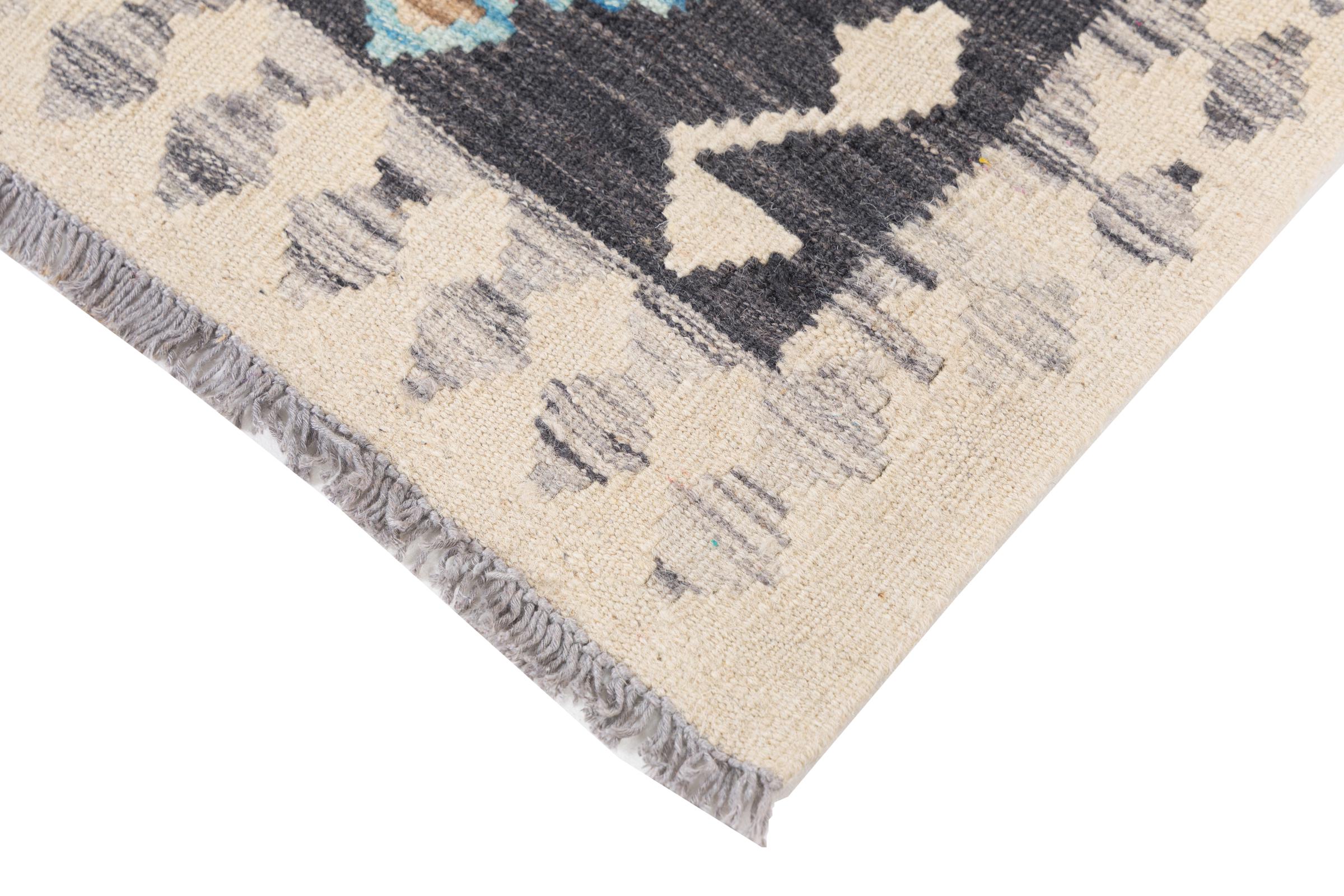 This rug was made as a flat weave by hand on a loom. Flatweave is the term used to describe rugs that have no pile. As the name promises, these rugs are woven and not knotted. This results in a flat rug with a structured surface. Flatweaves are not as soft and usually thinner than knotted rugs. At the same time they are much less complex to manufacture and can usually be laid out from both sides (front and back). Their patterns are usually geometric, which is determined by the fabric.