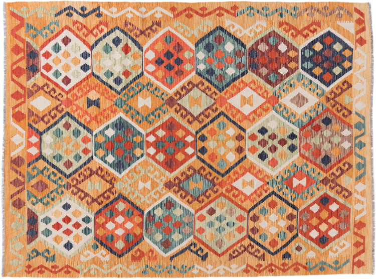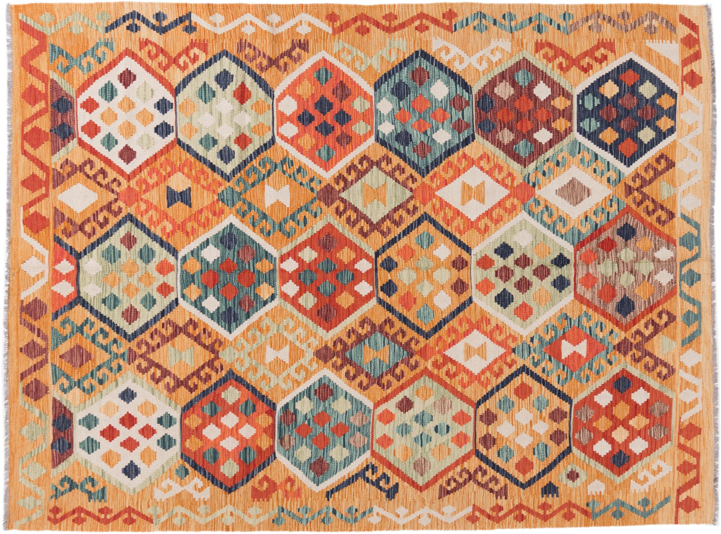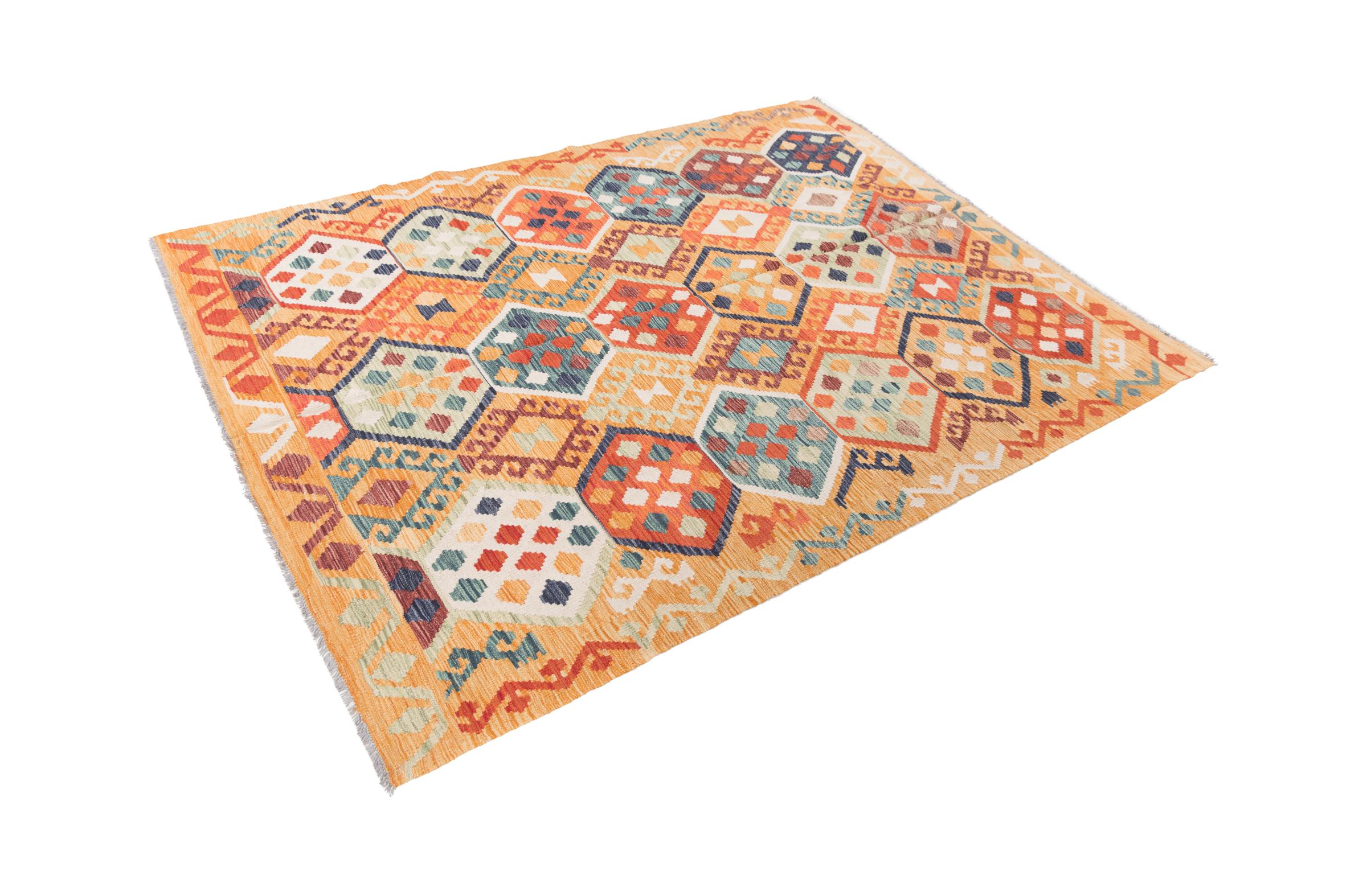 Carpet ID: 2944370047790 Size: 247x187 cm Thickness: ap. 3 mm Manufacturing: Woven by hand Pile: Handspun wool Warp: Sheep wool Origin: Afghanistan Age: New Weight: ap. 7 kg Also know as Kilim, Qilim, Chilim, Afgan, Afghán In stock: Unique - Only 1 in stock