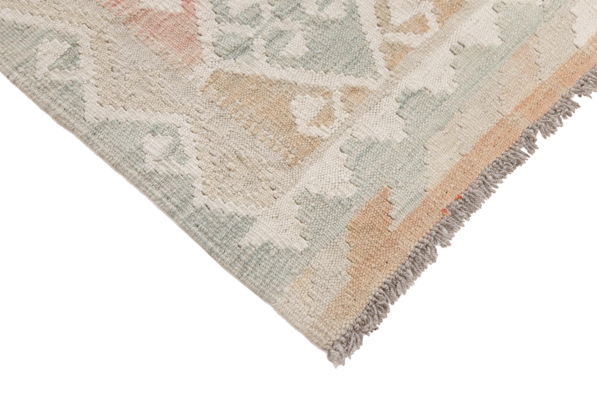 This rug was made as a flat weave by hand on a loom. Flatweave is the term used to describe rugs that have no pile. As the name promises, these rugs are woven and not knotted. This results in a flat rug with a structured surface. Flatweaves are not as soft and usually thinner than knotted rugs. At the same time they are much less complex to manufacture and can usually be laid out from both sides (front and back). Their patterns are usually geometric, which is determined by the fabric.