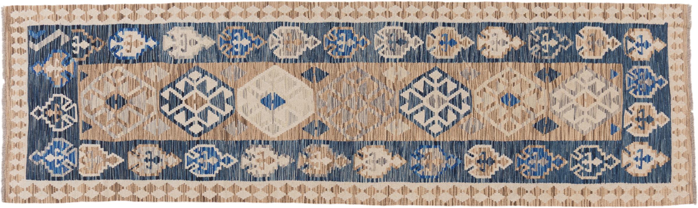 Carpet ID: 2945520045954 Size: 290x85 cm Thickness: ap. 3 mm Manufacturing: Woven by hand Pile: Handspun wool Warp: Sheep wool Origin: Afghanistan Age: New Weight: ap. 4 kg Also know as Kilim, Qilim, Chilim, Afgan, Afghán In stock: Unique - Only 1 in stock