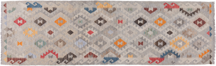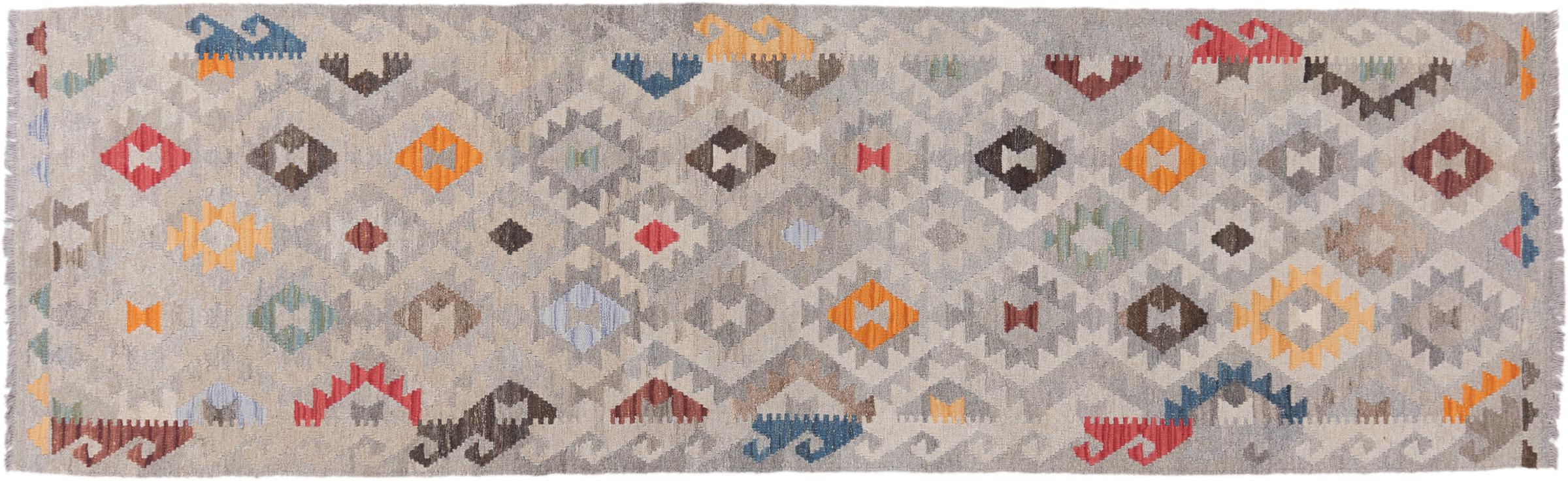 Carpet ID: 2943670047032 Size: 292x88 cm Thickness: ap. 3 mm Manufacturing: Woven by hand Pile: Handspun wool Warp: Sheep wool Origin: Afghanistan Age: New Weight: ap. 4 kg Also know as Kilim, Qilim, Chilim, Afgan, Afghán In stock: Unique - Only 1 in stock