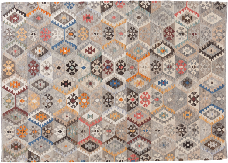 This rug was made as a flat weave by hand on a loom. Flatweave is the term used to describe rugs that have no pile. As the name promises, these rugs are woven and not knotted. This results in a flat rug with a structured surface. Flatweaves are not as soft and usually thinner than knotted rugs. At the same time they are much less complex to manufacture and can usually be laid out from both sides (front and back). Their patterns are usually geometric, which is determined by the fabric.