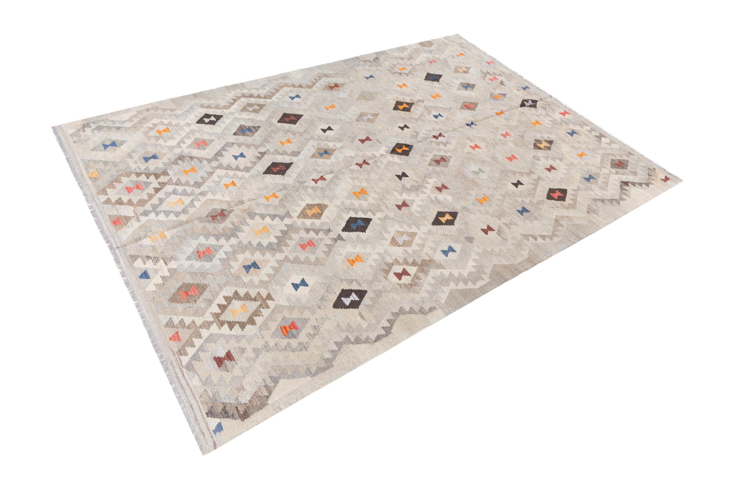Carpet ID: 2941850050062 Size: 297x205 cm Thickness: ap. 3 mm Manufacturing: Woven by hand Pile: Handspun wool Warp: Sheep wool Origin: Afghanistan Age: New Weight: ap. 9 kg Also know as Kilim, Qilim, Chilim, Afgan, Afghán In stock: Unique - Only 1 in stock