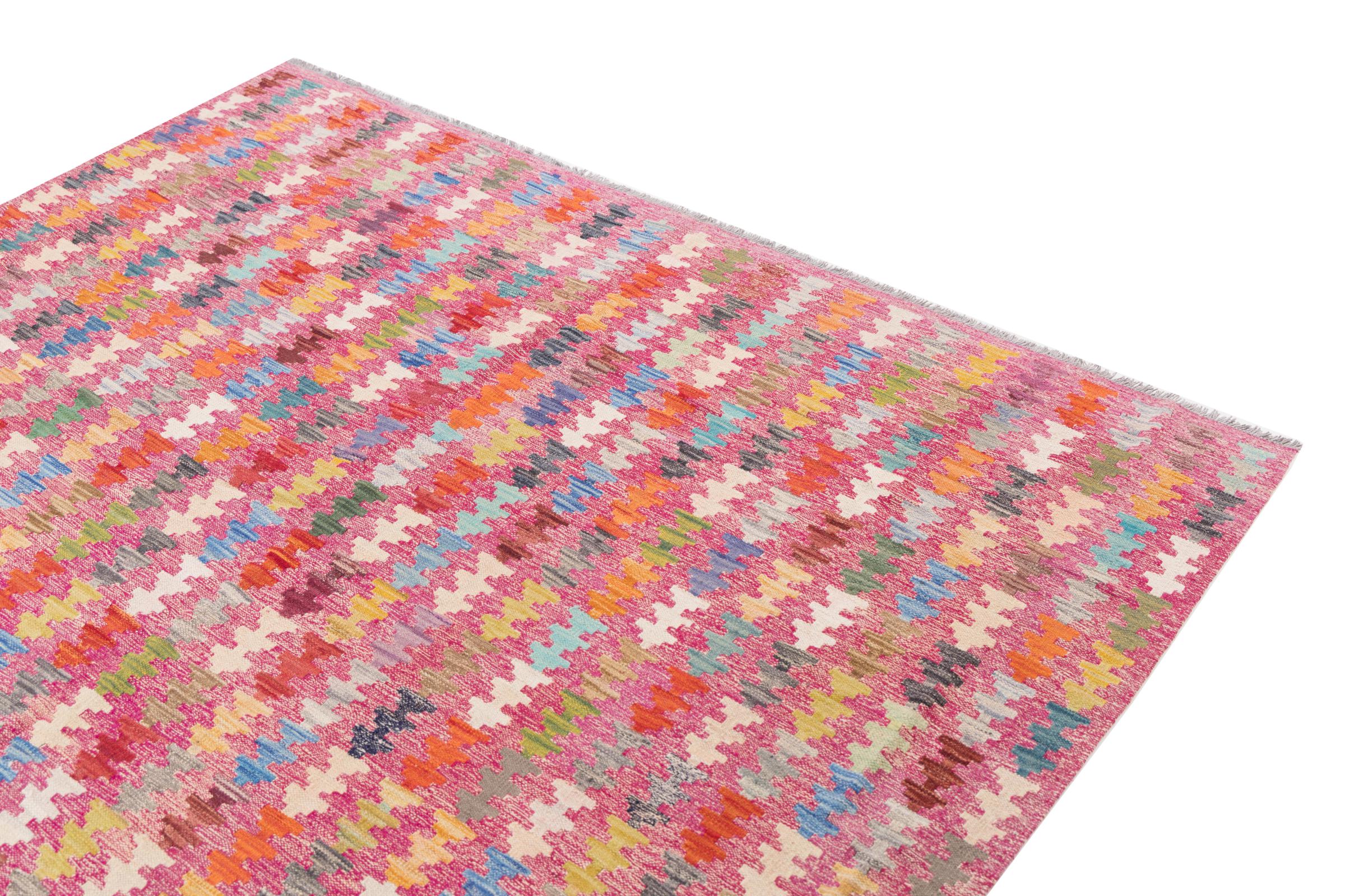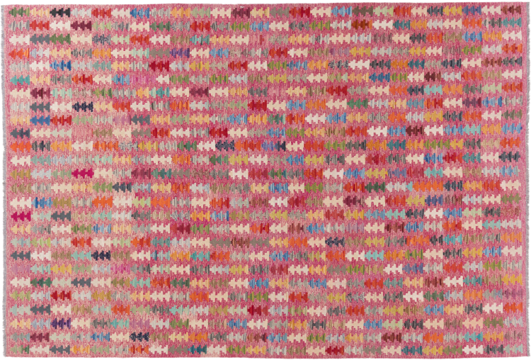 This rug was made as a flat weave by hand on a loom. Flatweave is the term used to describe rugs that have no pile. As the name promises, these rugs are woven and not knotted. This results in a flat rug with a structured surface. Flatweaves are not as soft and usually thinner than knotted rugs. At the same time they are much less complex to manufacture and can usually be laid out from both sides (front and back). Their patterns are usually geometric, which is determined by the fabric.
