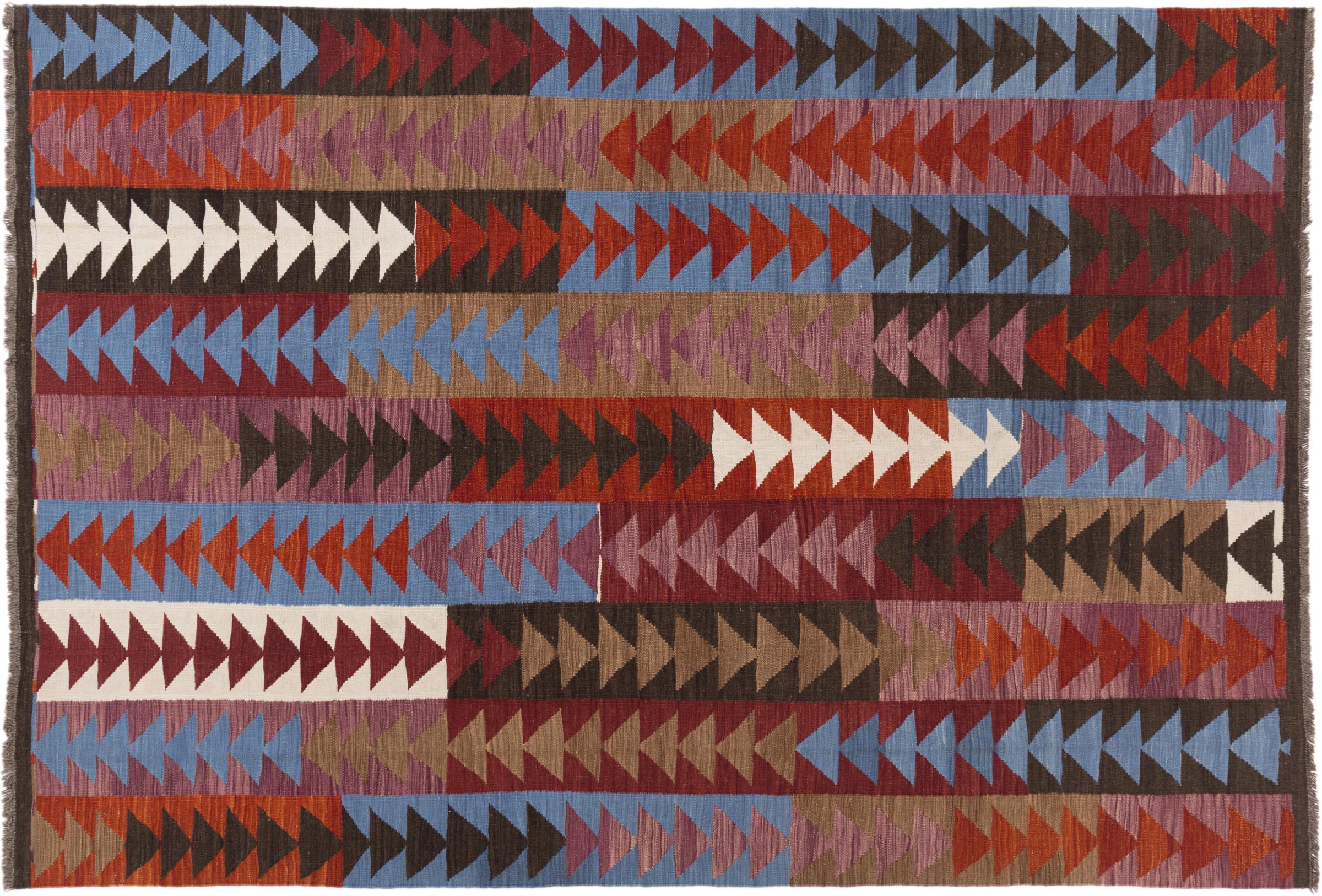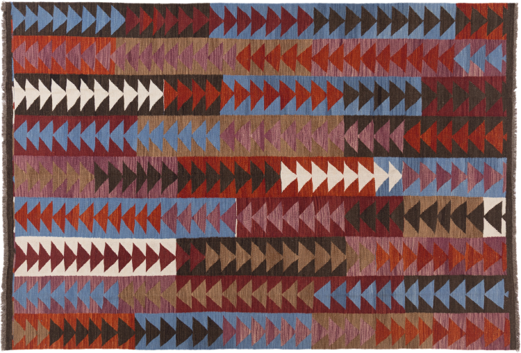 This rug was made as a flat weave by hand on a loom. Flatweave is the term used to describe rugs that have no pile. As the name promises, these rugs are woven and not knotted. This results in a flat rug with a structured surface. Flatweaves are not as soft and usually thinner than knotted rugs. At the same time they are much less complex to manufacture and can usually be laid out from both sides (front and back). Their patterns are usually geometric, which is determined by the fabric.