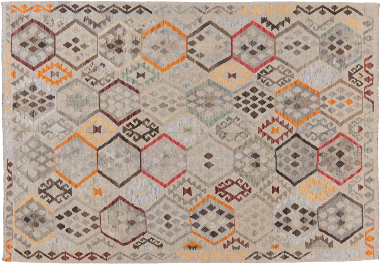 This rug was made as a flat weave by hand on a loom. Flatweave is the term used to describe rugs that have no pile. As the name promises, these rugs are woven and not knotted. This results in a flat rug with a structured surface. Flatweaves are not as soft and usually thinner than knotted rugs. At the same time they are much less complex to manufacture and can usually be laid out from both sides (front and back). Their patterns are usually geometric, which is determined by the fabric.