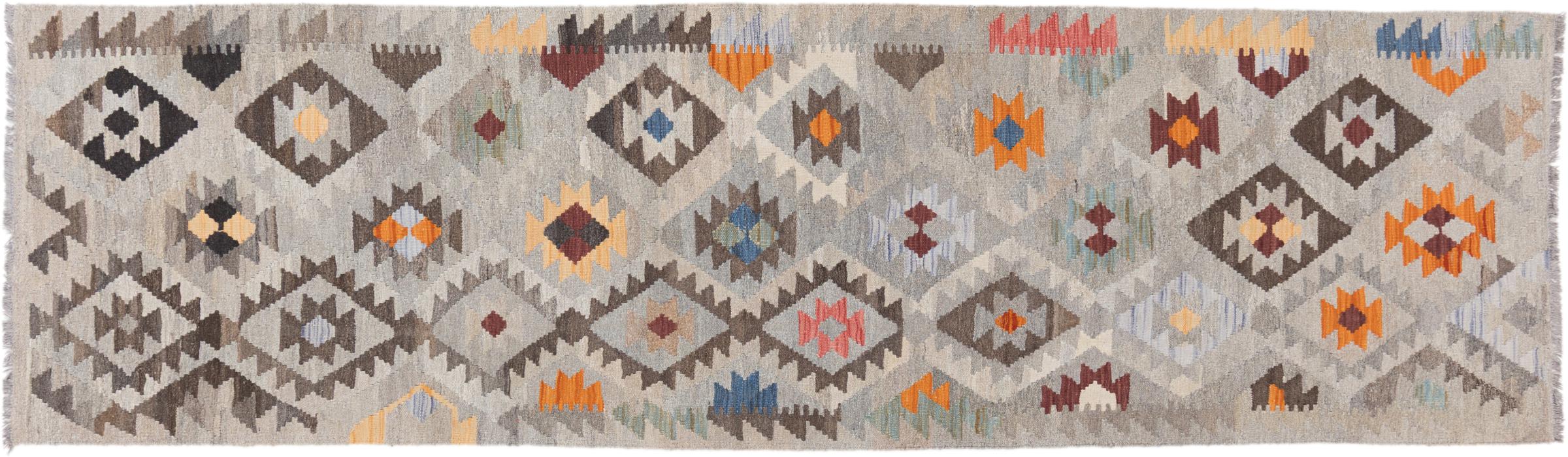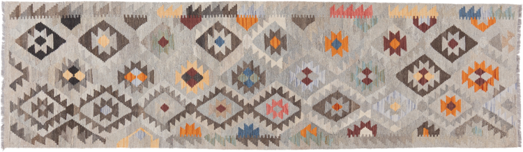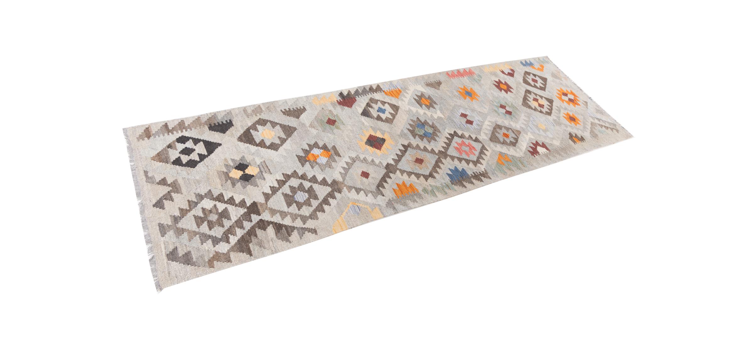 Carpet ID: 2949180050049 Size: 301x85 cm Thickness: ap. 3 mm Manufacturing: Woven by hand Pile: Handspun wool Warp: Sheep wool Origin: Afghanistan Age: New Weight: ap. 4 kg Also know as Kilim, Qilim, Chilim, Afgan, Afghán In stock: Unique - Only 1 in stock