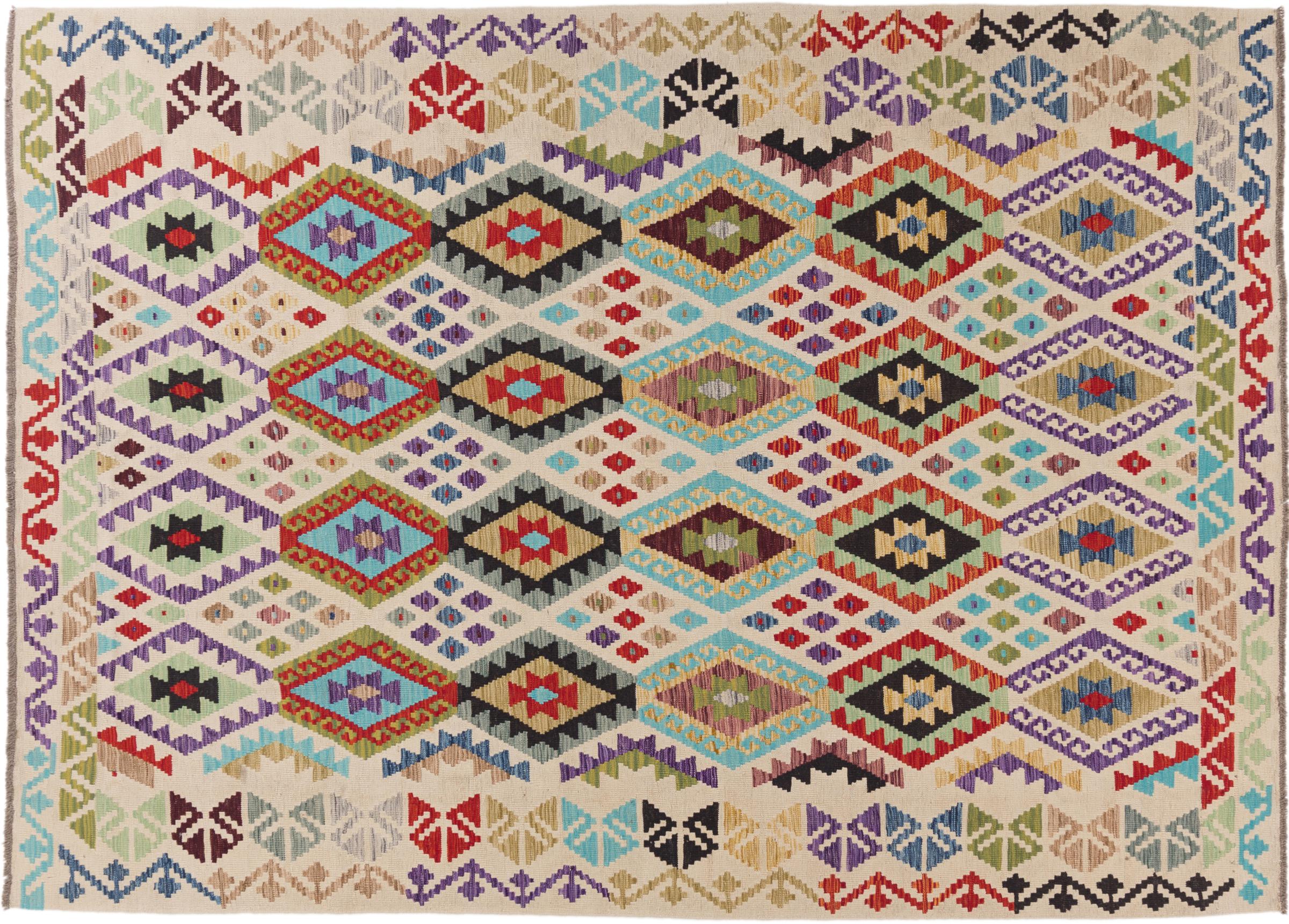 Carpet ID: 2949400045284 Size: 303x221 cm Thickness: ap. 3 mm Manufacturing: Woven by hand Pile: Handspun wool Warp: Sheep wool Origin: Afghanistan Age: New Weight: ap. 10 kg Also know as Kilim, Qilim, Chilim, Afgan, Afghán In stock: Unique - Only 1 in stock