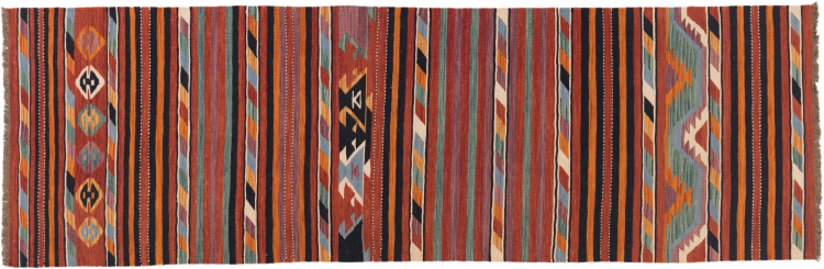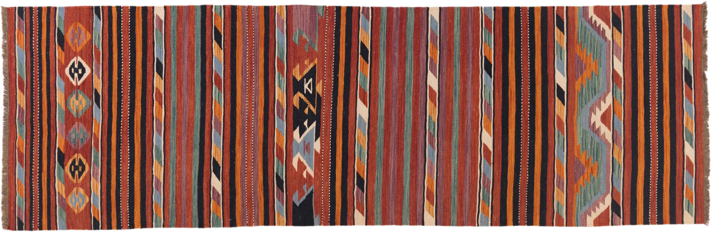 Carpet ID: 2943520049780 Size: 304x97 cm Thickness: ap. 3 mm Manufacturing: Woven by hand Pile: Handspun wool Warp: Sheep wool Origin: Afghanistan Age: New Weight: ap. 4 kg Also know as Kilim, Qilim, Chilim, Afgan, Afghán In stock: Unique - Only 1 in stock