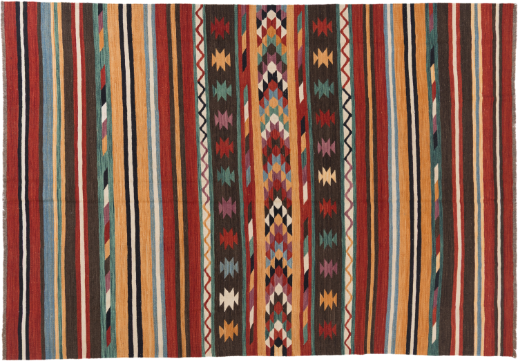 Carpet ID: 2943450049852 Size: 308x213 cm Thickness: ap. 3 mm Manufacturing: Woven by hand Pile: Handspun wool Warp: Sheep wool Origin: Afghanistan Age: New Weight: ap. 10 kg Also know as Kilim, Qilim, Chilim, Afgan, Afghán In stock: Unique - Only 1 in stock