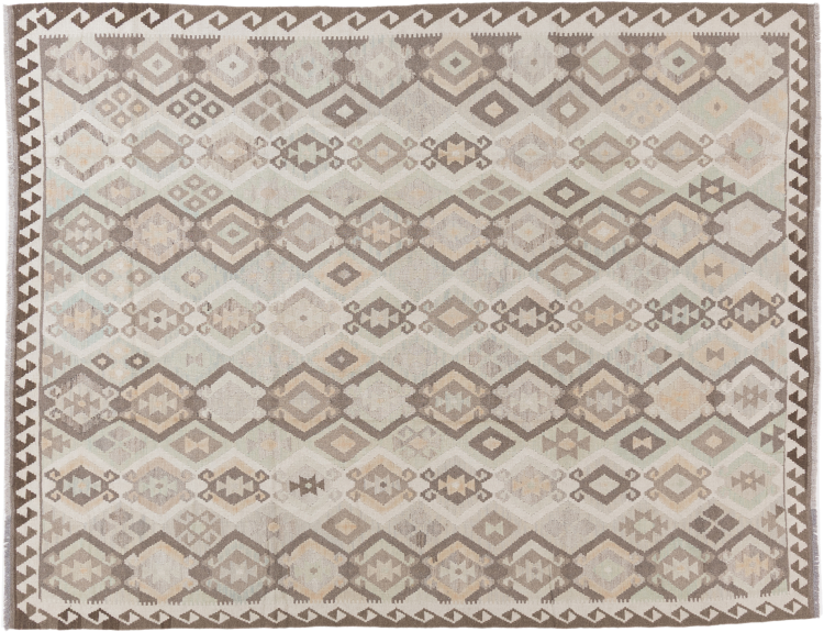 This rug was made as a flat weave by hand on a loom. Flatweave is the term used to describe rugs that have no pile. As the name promises, these rugs are woven and not knotted. This results in a flat rug with a structured surface. Flatweaves are not as soft and usually thinner than knotted rugs. At the same time they are much less complex to manufacture and can usually be laid out from both sides (front and back). Their patterns are usually geometric, which is determined by the fabric.