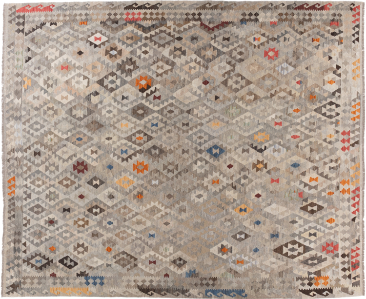 This rug was made as a flat weave by hand on a loom. Flatweave is the term used to describe rugs that have no pile. As the name promises, these rugs are woven and not knotted. This results in a flat rug with a structured surface. Flatweaves are not as soft and usually thinner than knotted rugs. At the same time they are much less complex to manufacture and can usually be laid out from both sides (front and back). Their patterns are usually geometric, which is determined by the fabric.