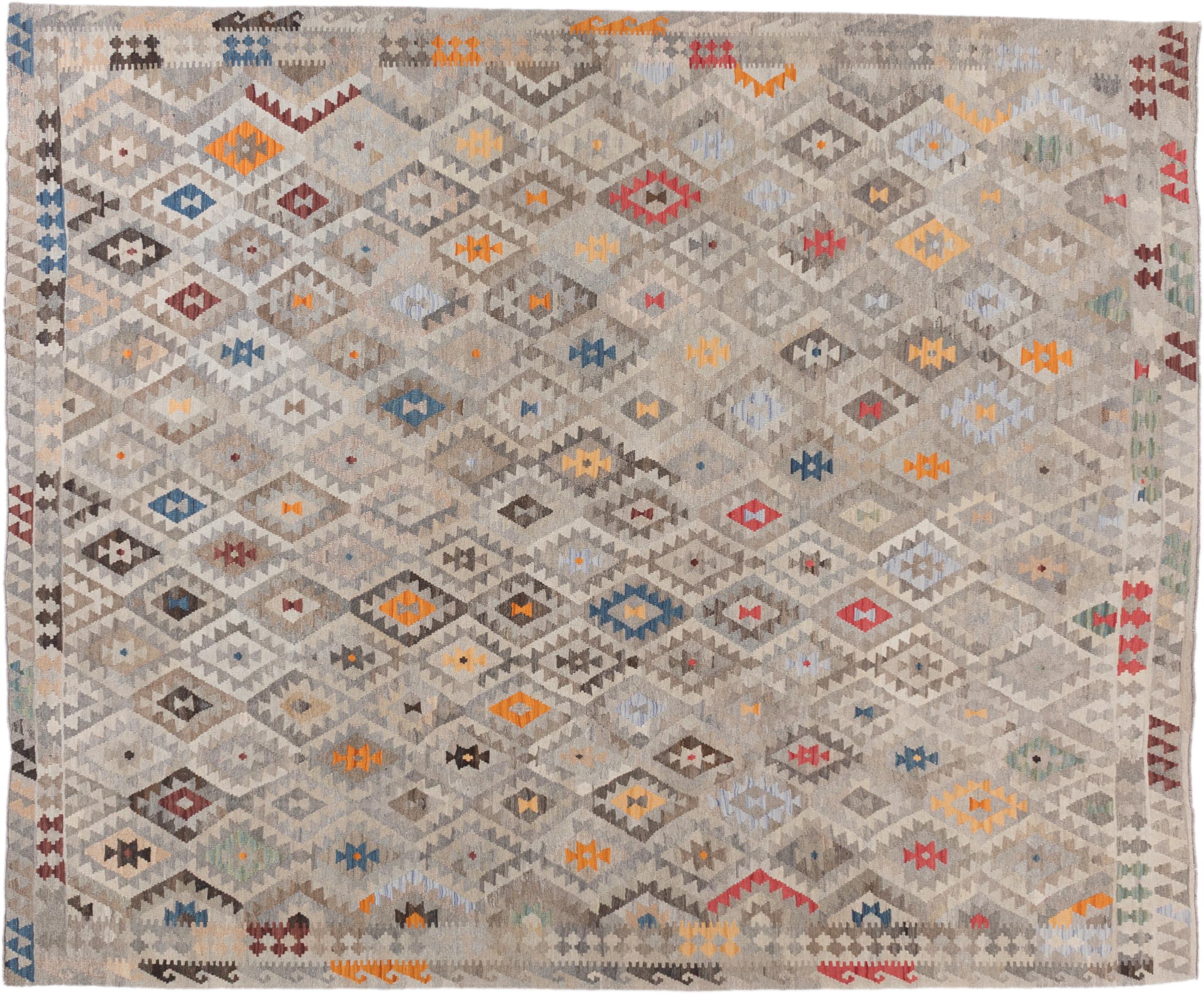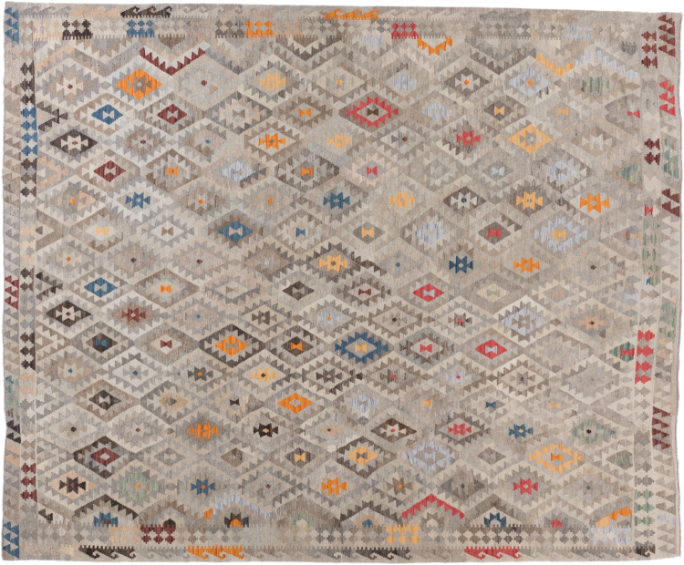 This rug was made as a flat weave by hand on a loom. Flatweave is the term used to describe rugs that have no pile. As the name promises, these rugs are woven and not knotted. This results in a flat rug with a structured surface. Flatweaves are not as soft and usually thinner than knotted rugs. At the same time they are much less complex to manufacture and can usually be laid out from both sides (front and back). Their patterns are usually geometric, which is determined by the fabric.