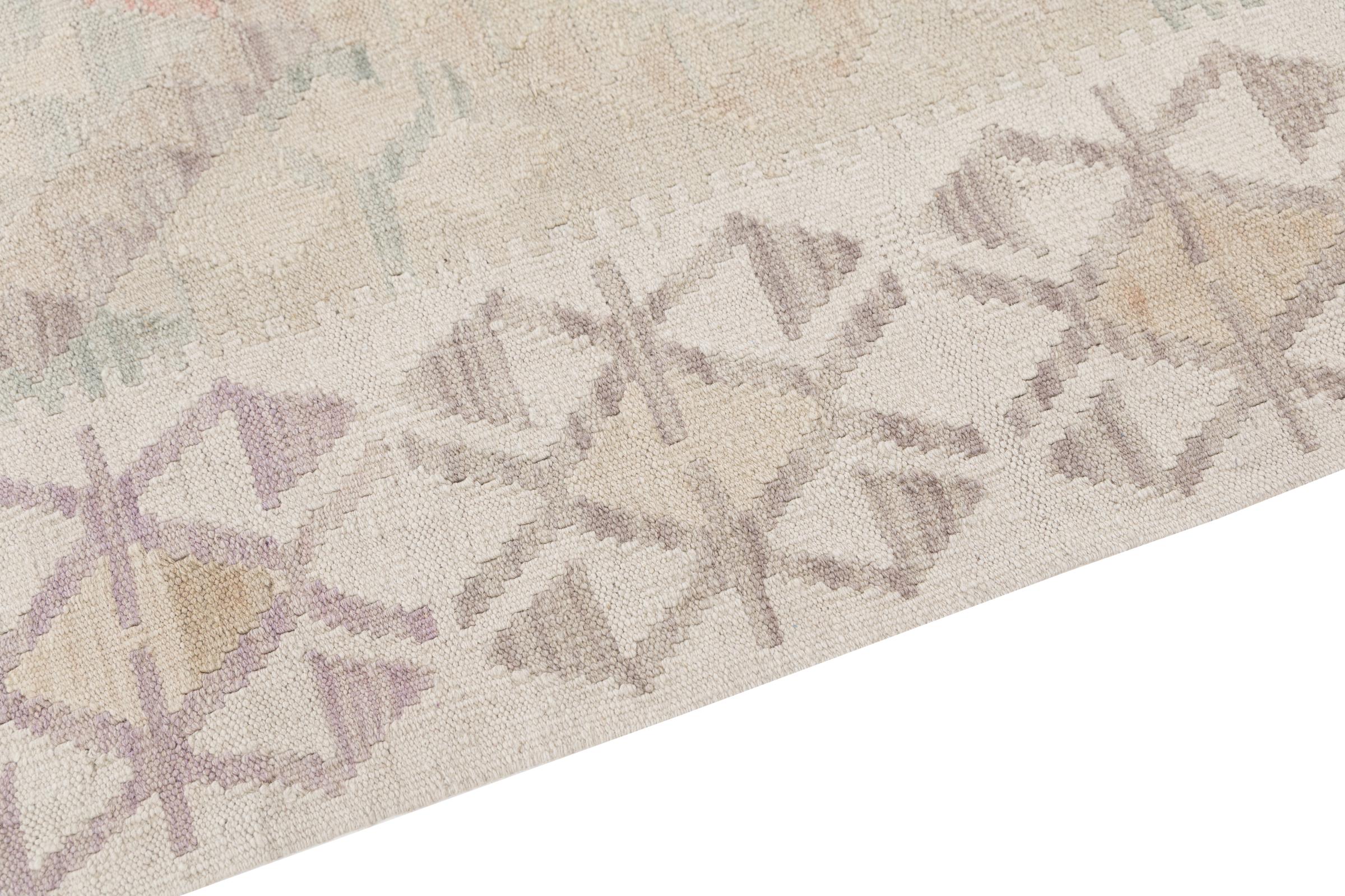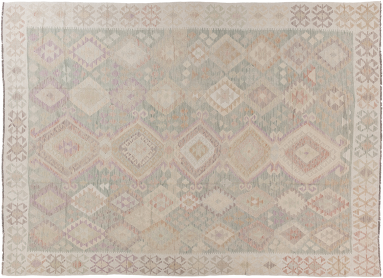 This rug was made as a flat weave by hand on a loom. Flatweave is the term used to describe rugs that have no pile. As the name promises, these rugs are woven and not knotted. This results in a flat rug with a structured surface. Flatweaves are not as soft and usually thinner than knotted rugs. At the same time they are much less complex to manufacture and can usually be laid out from both sides (front and back). Their patterns are usually geometric, which is determined by the fabric.