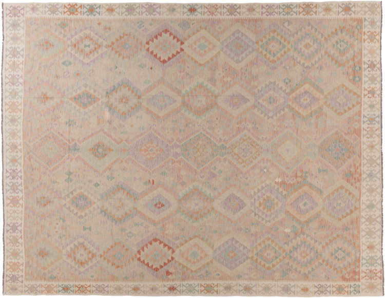 This rug was made as a flat weave by hand on a loom. Flatweave is the term used to describe rugs that have no pile. As the name promises, these rugs are woven and not knotted. This results in a flat rug with a structured surface. Flatweaves are not as soft and usually thinner than knotted rugs. At the same time they are much less complex to manufacture and can usually be laid out from both sides (front and back). Their patterns are usually geometric, which is determined by the fabric.