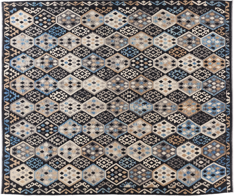 Carpet ID: 2941070051813 Size: 390x331 cm Thickness: ap. 3 mm Manufacturing: Woven by hand Pile: Handspun wool Warp: Sheep wool Origin: Afghanistan Age: New Weight: ap. 19 kg Also know as Kilim, Qilim, Chilim, Afgan, Afghán In stock: Unique - Only 1 in stock