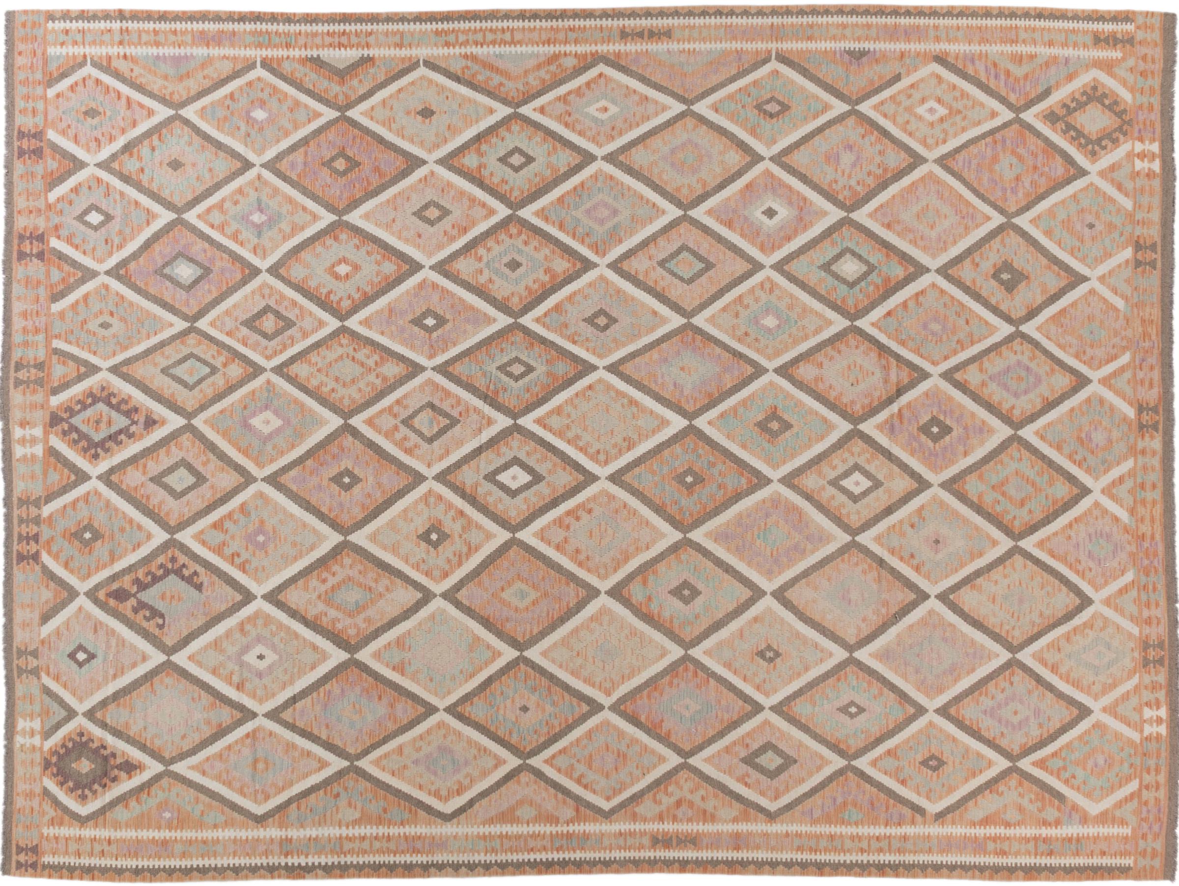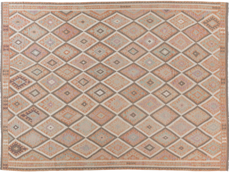This rug was made as a flat weave by hand on a loom. Flatweave is the term used to describe rugs that have no pile. As the name promises, these rugs are woven and not knotted. This results in a flat rug with a structured surface. Flatweaves are not as soft and usually thinner than knotted rugs. At the same time they are much less complex to manufacture and can usually be laid out from both sides (front and back). Their patterns are usually geometric, which is determined by the fabric.